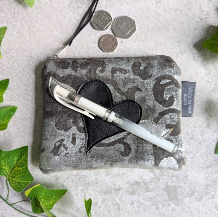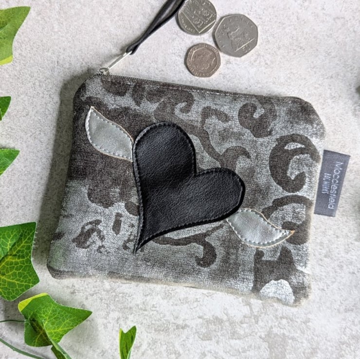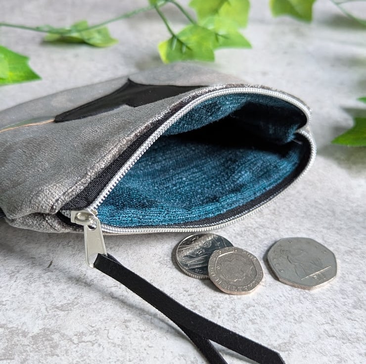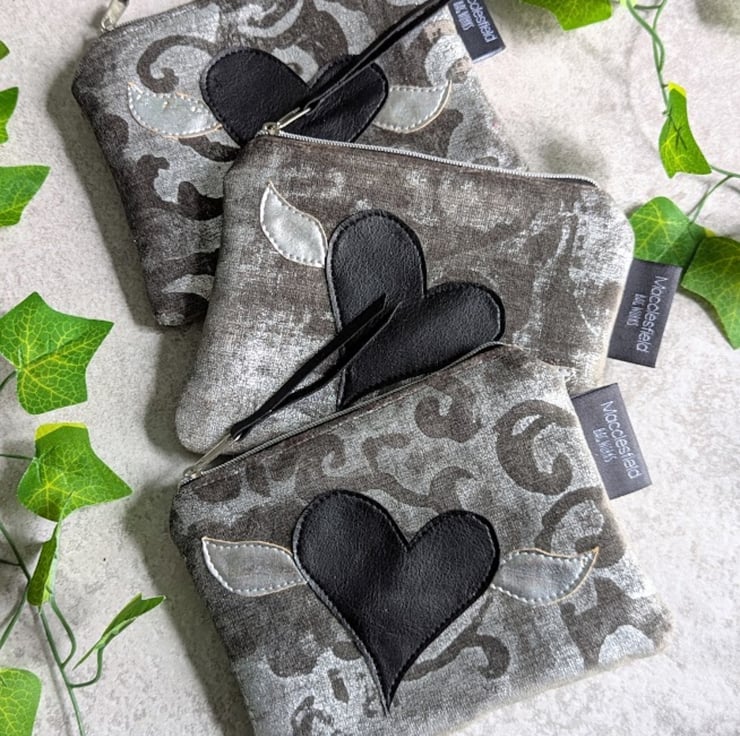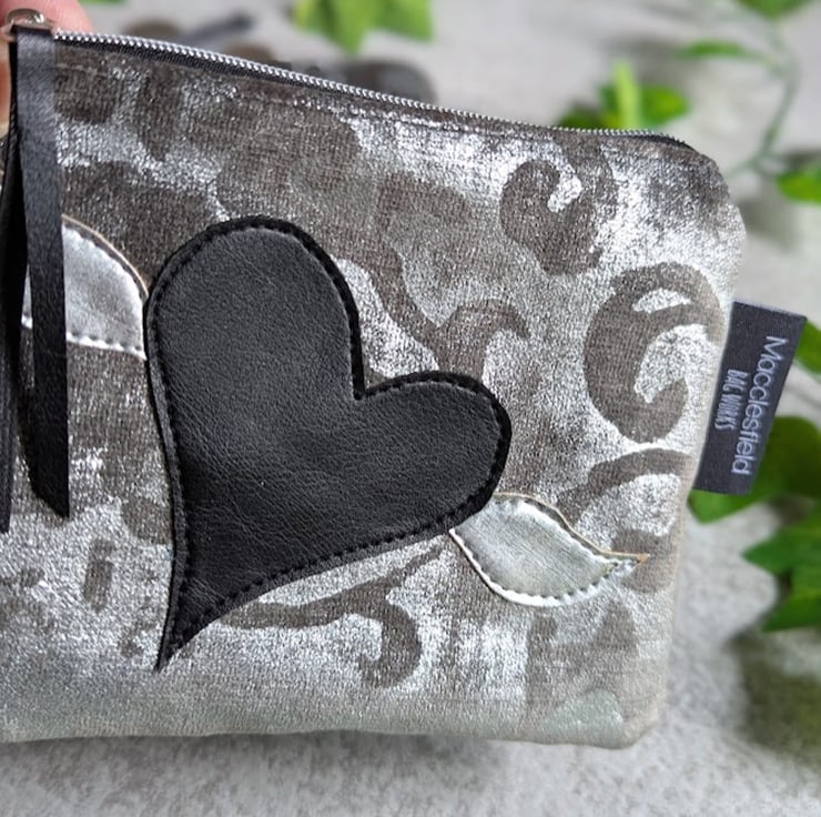 Designed as a purse, but could also be used as a small make-up bag or to hold those little bits and pieces in your bag. Inside, the purse has been lined with a dark teal slubbed fabric (on testing, I think it's silk or silk mix but can't be 100% sure) and has a hand appliqued design featuring a black PU heart and silver coloured cork fabric wings. The purse has a black and silver nylon zip with a black PU zip pull.