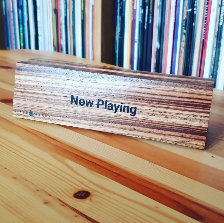 Handmade vinyl record display stand, made from a single piece of either sapele hardwood or zebrano , holds a single or double record for display or just a sleeve whilst playing.