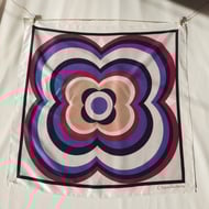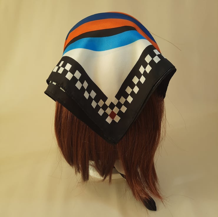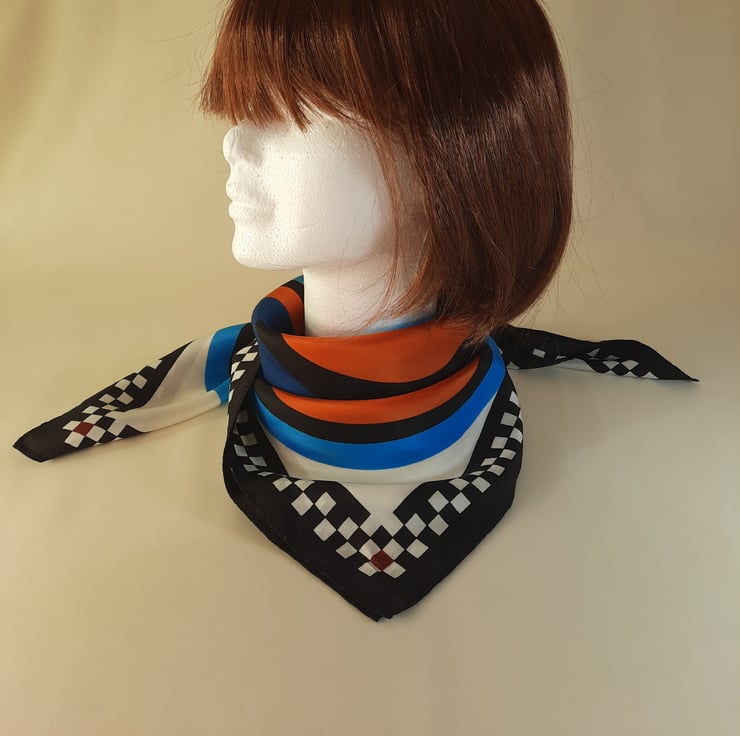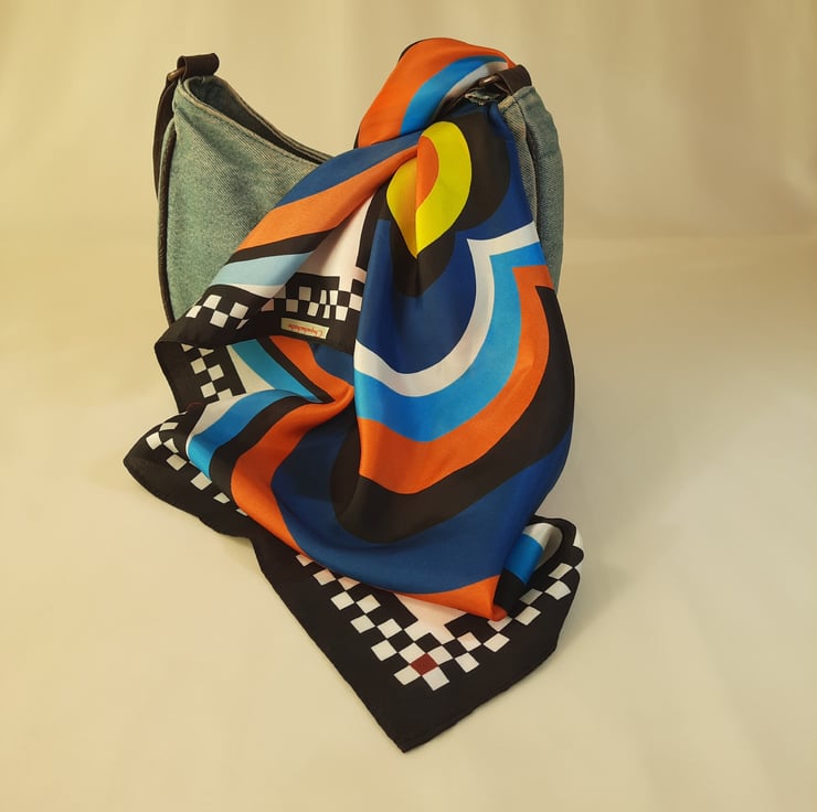 100% natural habotai silk scarf, soft and lightweight, featuring an exclusive design: black-and-white checkered border and multicolor geometric flower on a white background. Mixed technique: digital print, machine stitching, and hand finish. Size 65x65cm. Versatile for neck, hair, or bag. Each piece is unique due to its handmade process. Perfect as an elegant and original gift.