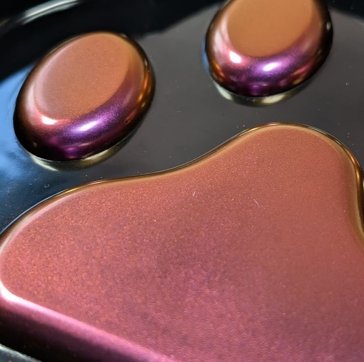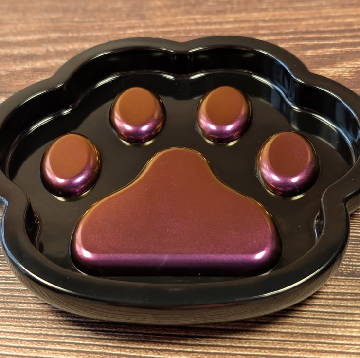 This paw dish is sleek and unapologetically dramatic. A deep black gives the whole thing a high-contrast, lacquered look while the pads shift between copper and magenta depending on angle. It’s tidy, smooth, and solid in the hand — exactly what a small dish should be.