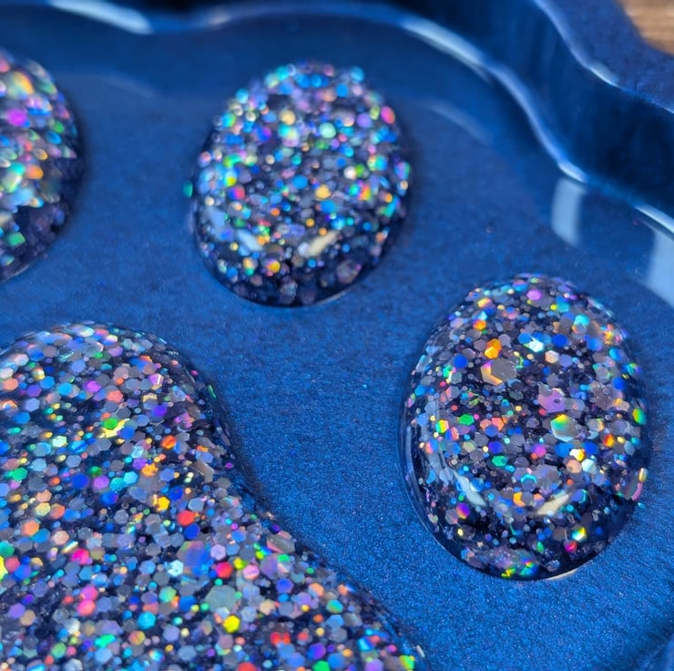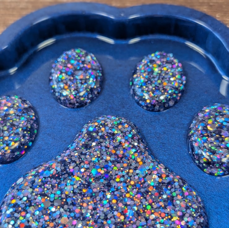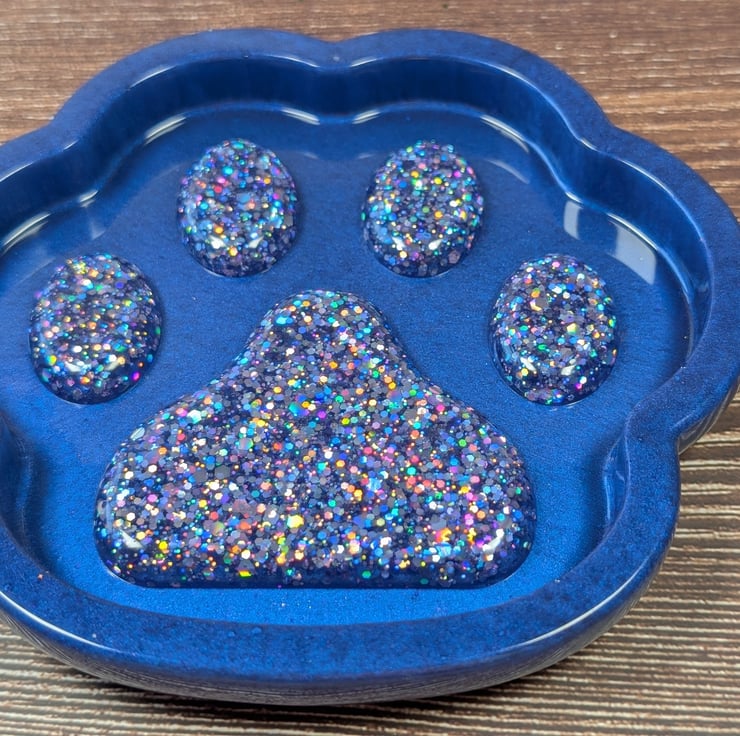 This paw dish is made for people who like their colours unapologetically bold. The base is a rich ultramarine blue with a soft metallic sheen, and the pads are packed with holographic glitter that throws rainbow flashes from every angle. When the light hits it, it looks like a tiny galaxy trapped in resin.