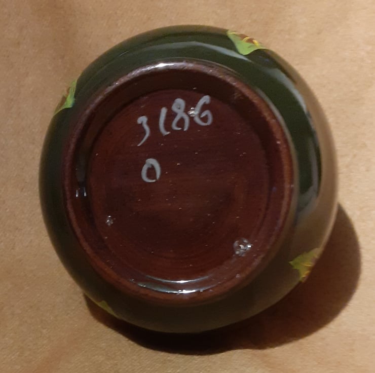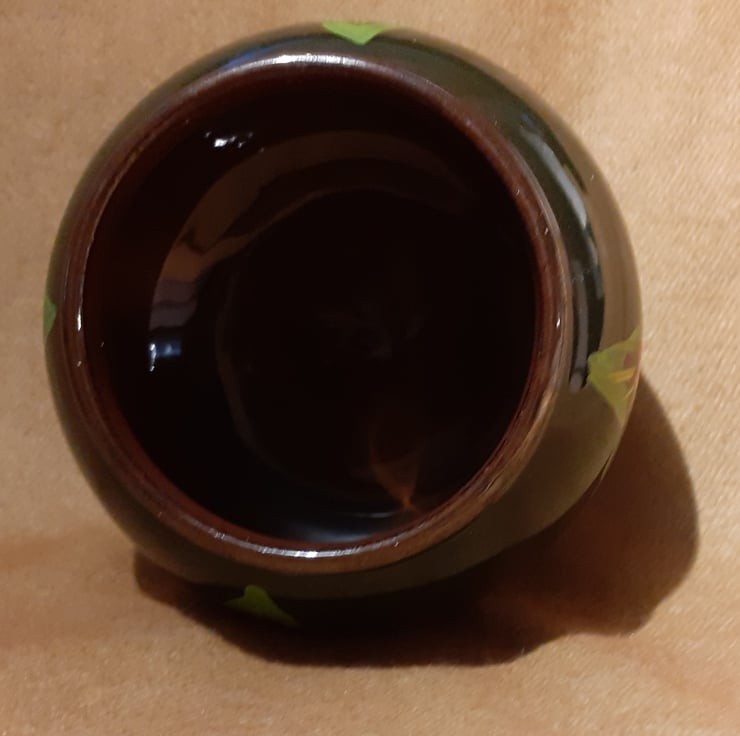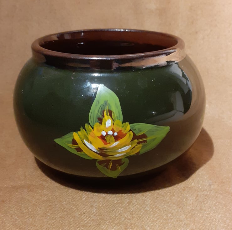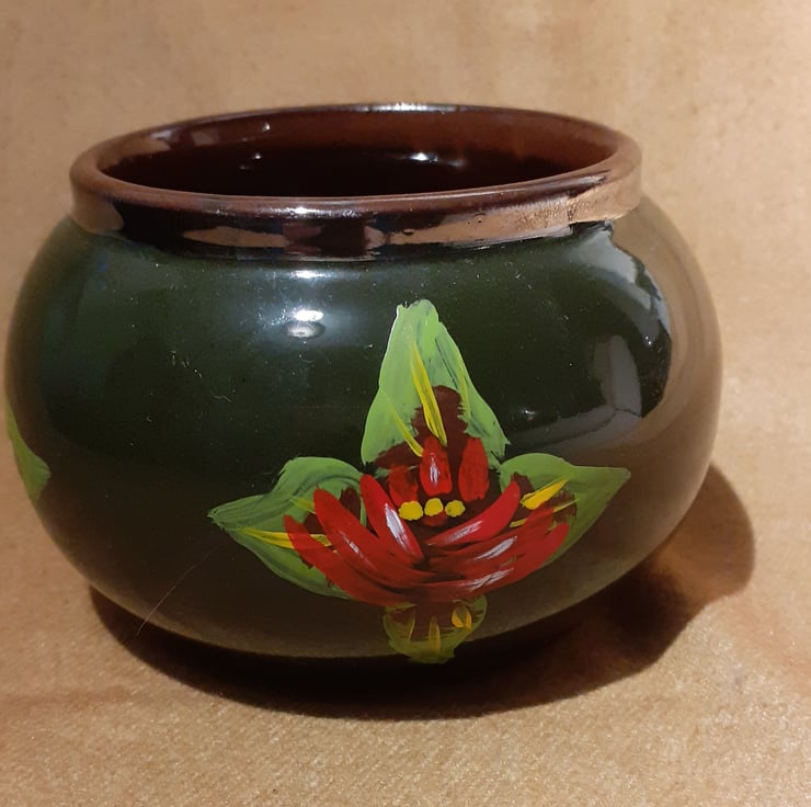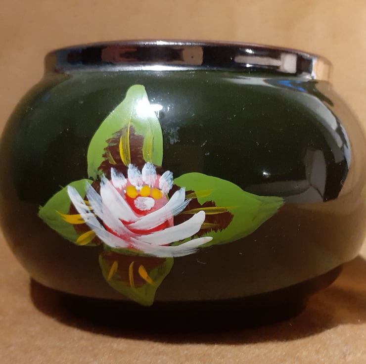 It is dark green with a silver rim and a brown interior. Red, yellow and white canal art style roses have been handpainted around the outside.