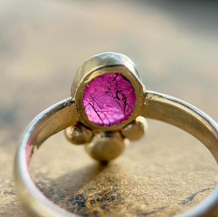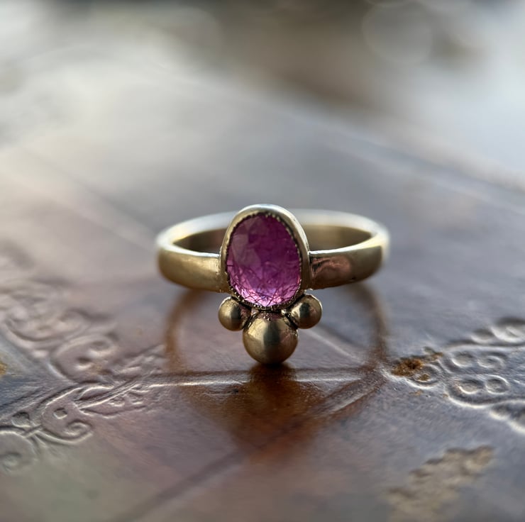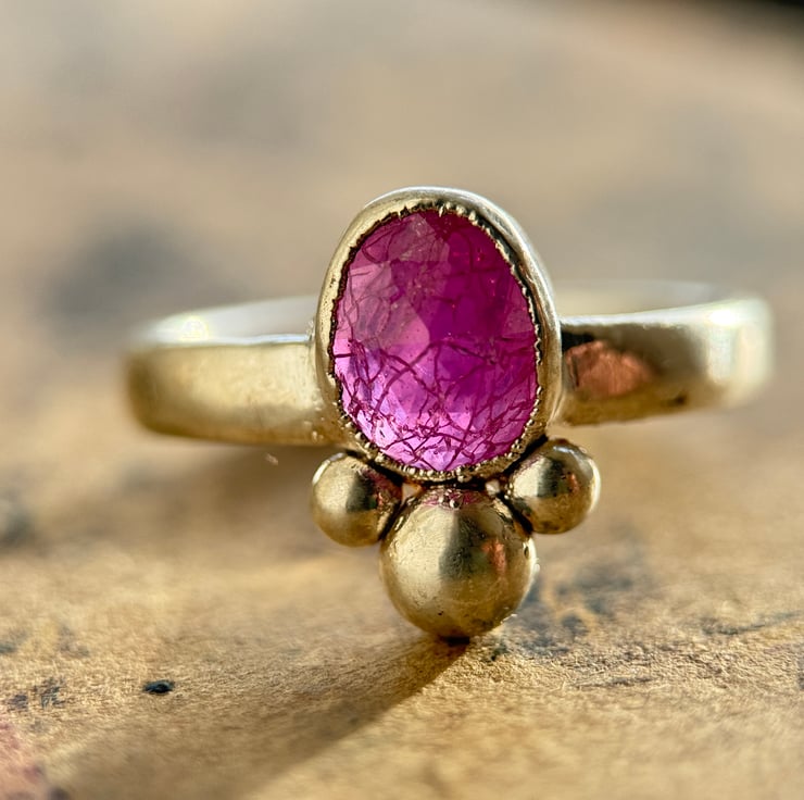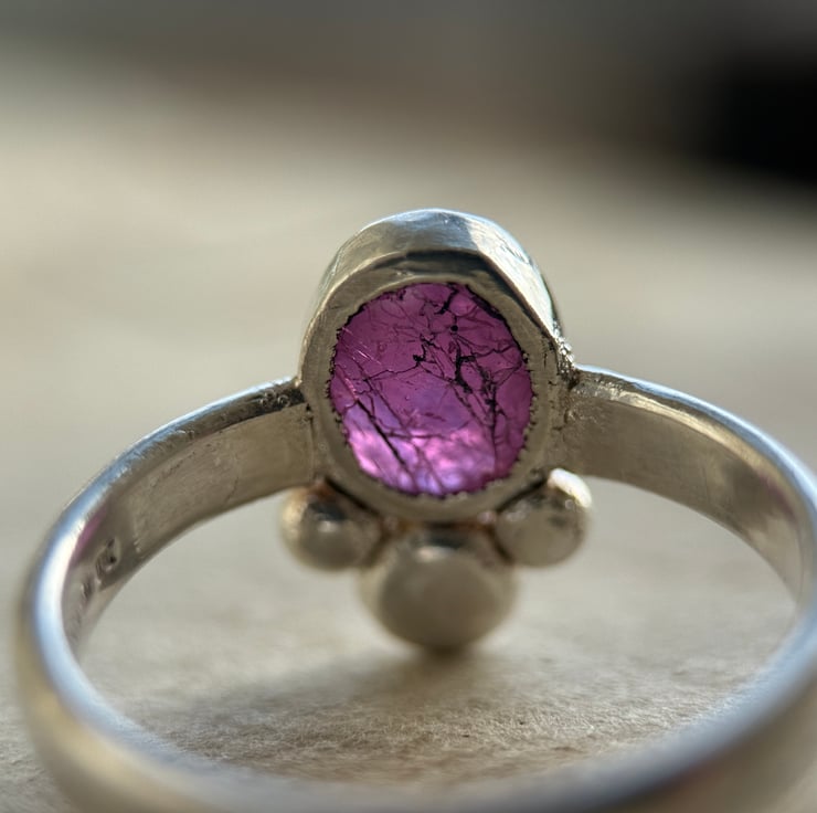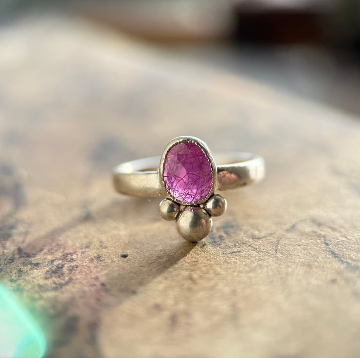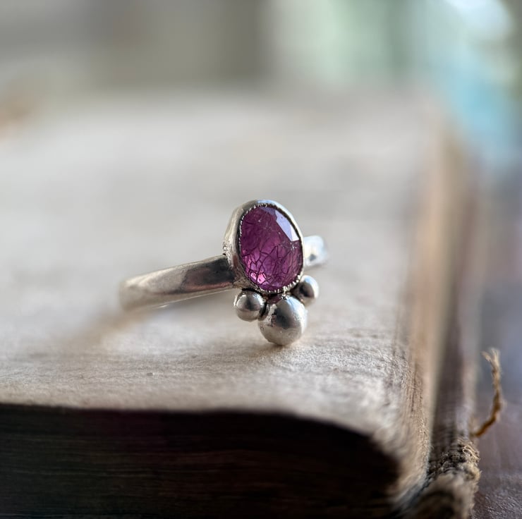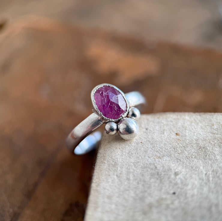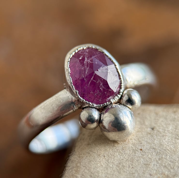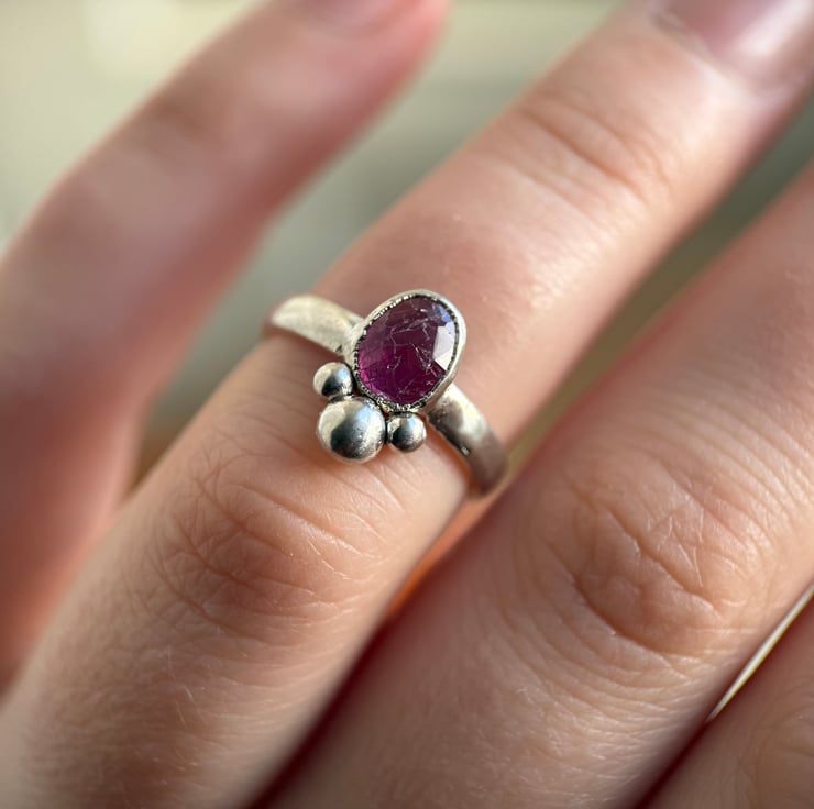 A one of a kind Sterling silver ruby ring, made from a natural rose cut ruby set onto a D shaped band.