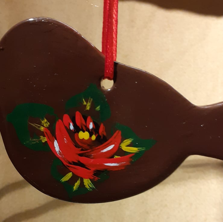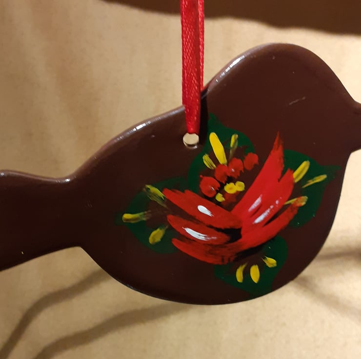 This ceramic hanging bird has been painted brown. A red canal art style rose has been paited on each side. A red hanging ribbon is attached to enable you to hang it in a location of your choice.