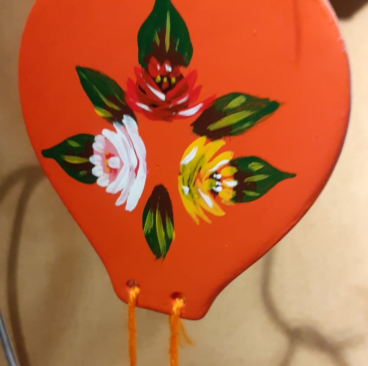 This ceramic hot air balloon has been paintedorange and decorated on one side with a group of canal art style roses.