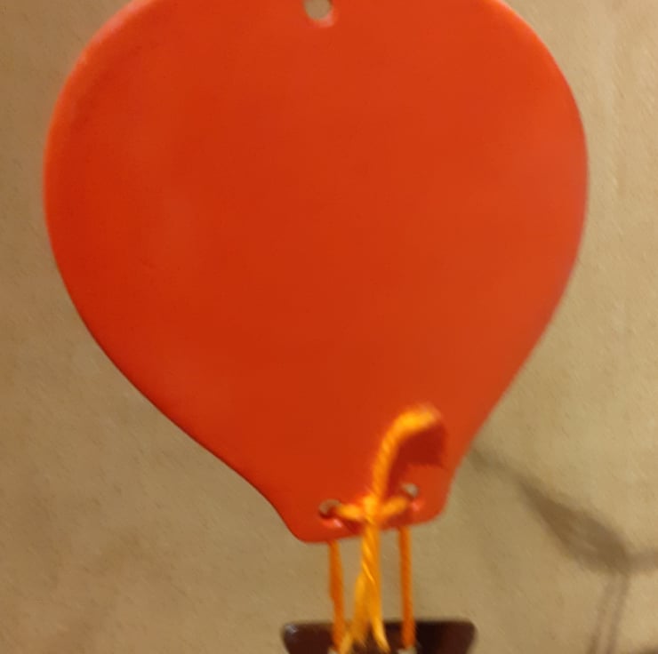 The ceramic basket is painted brown and is attached to the basket with orange wool. An orange ribbon is attached to the top of the balloon for easy hanging.