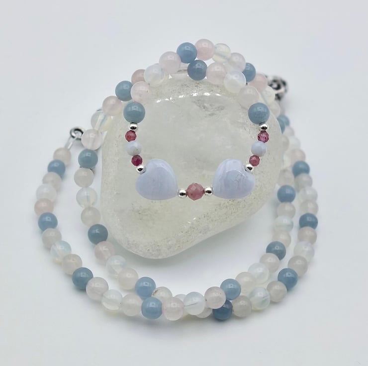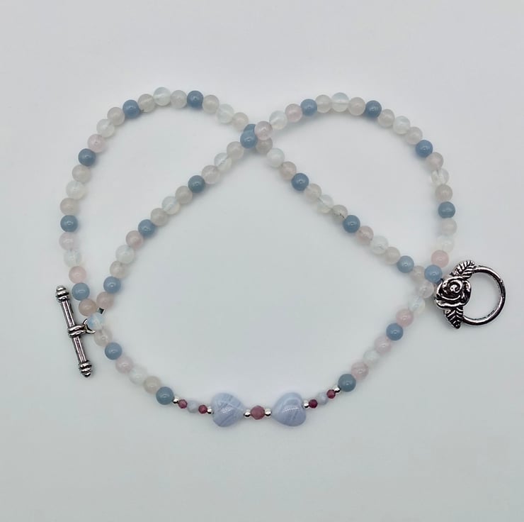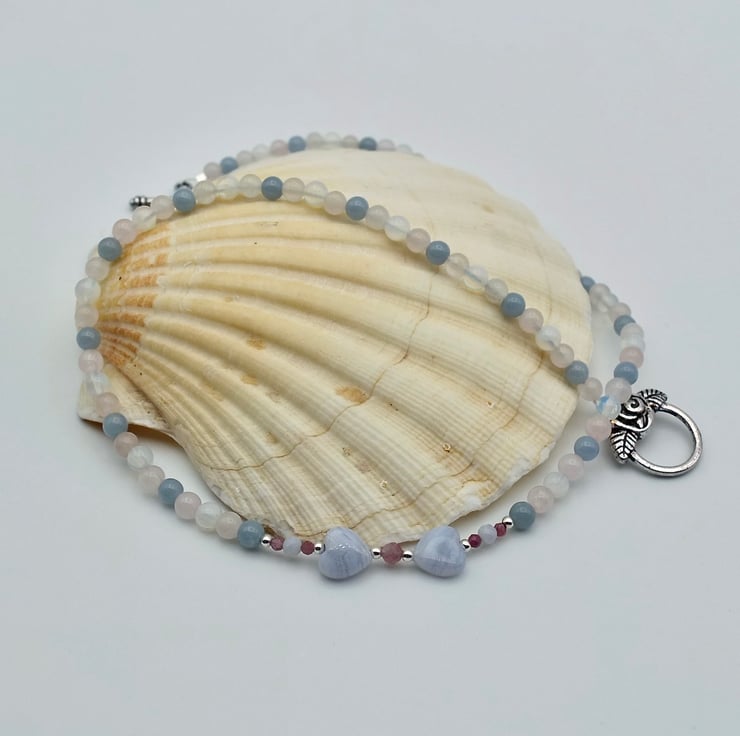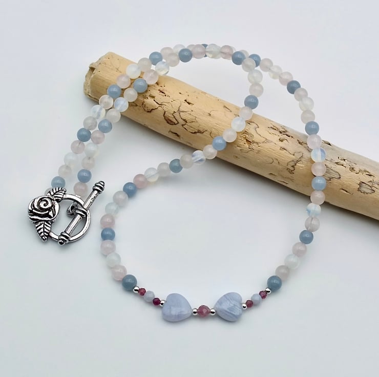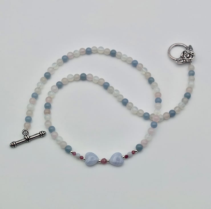 Pretty Gemstone necklace in pastel shades of blue, pink and white, with a centrepiece of Blue Lace Agate hearts.