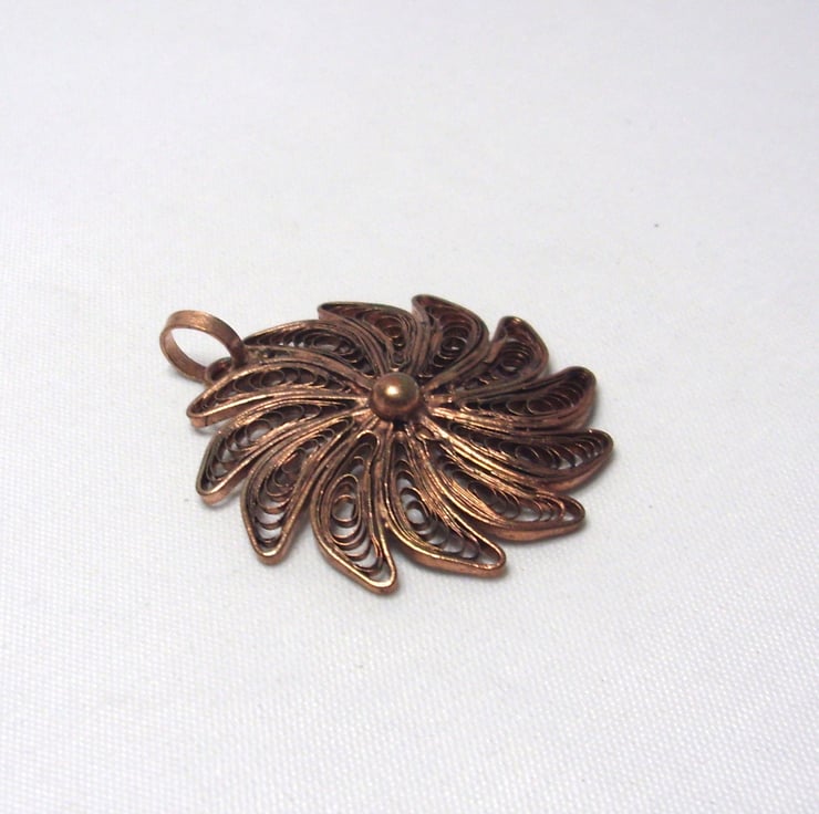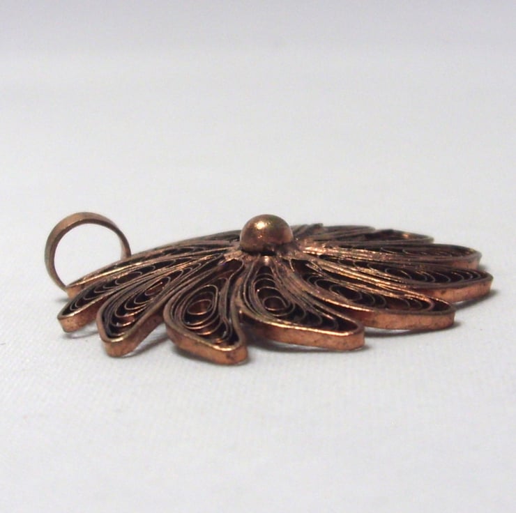 This copper necklace pendant made from copper features a swirl filigree pattern on each segment. There is a raised copper boss in the center and a copper loop bail at the top.