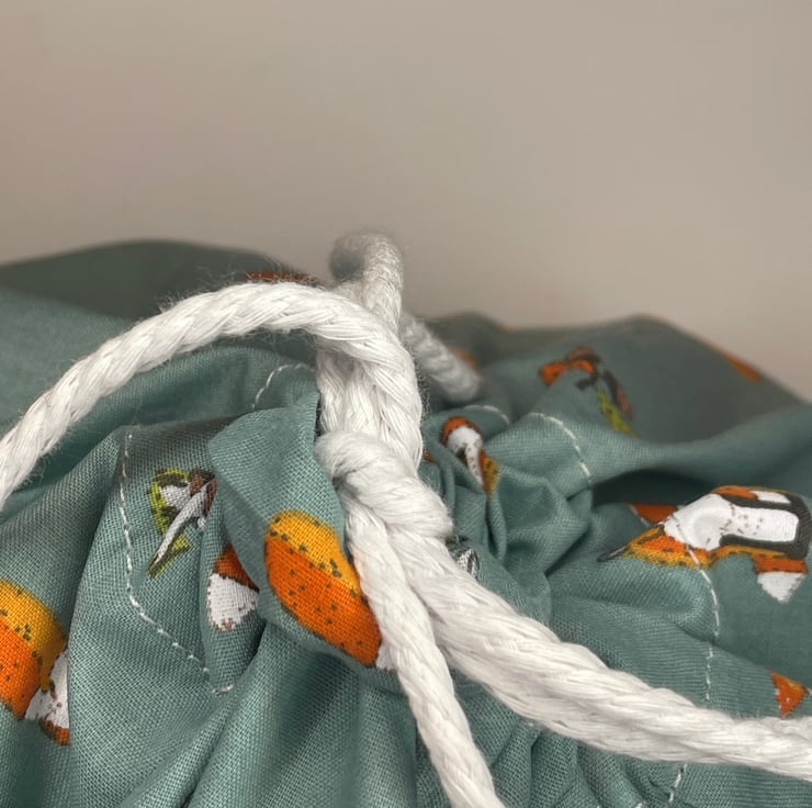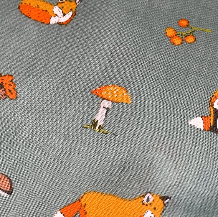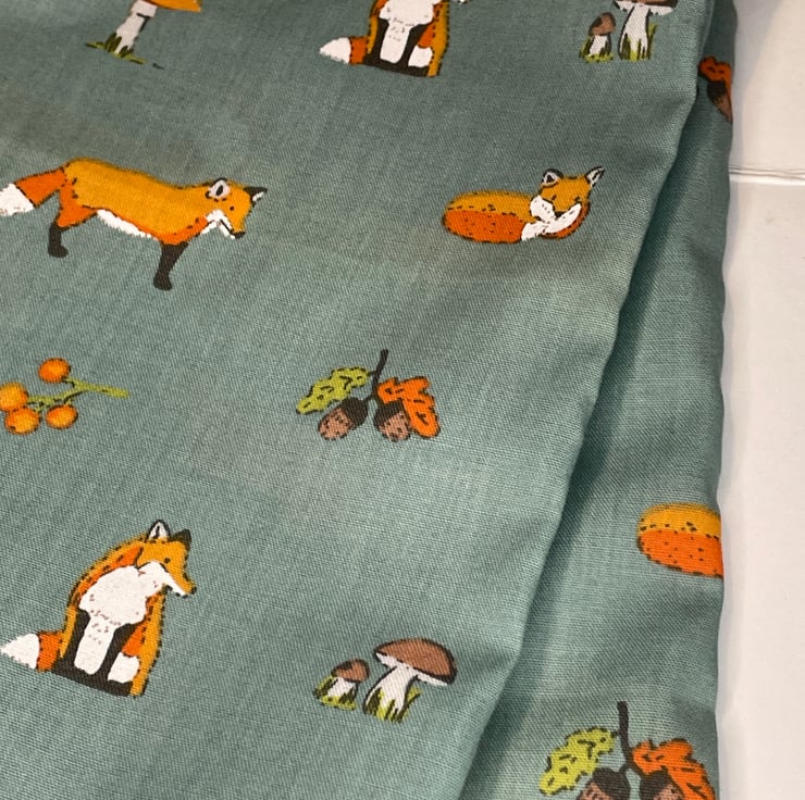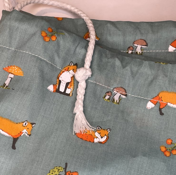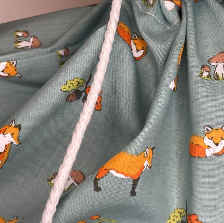 Foxy fun with reusable wrapping. This 33x42cm drawstring bag features some lovely countryside inspired images. The bag is a duck egg blue colour with foxes, mushrooms and toadstools and acorns printed on it. It is made of a lightweight polyester cotton fabric, all seamed with French seams to prevent fraying and a cotton rope style drawstring top. A lovely and sustainable way to send a gift or to store things in. It is a fairly generous size and would fit many different things. Why not be kind to the environment and use a fully reusable and sustainable gift wrap.