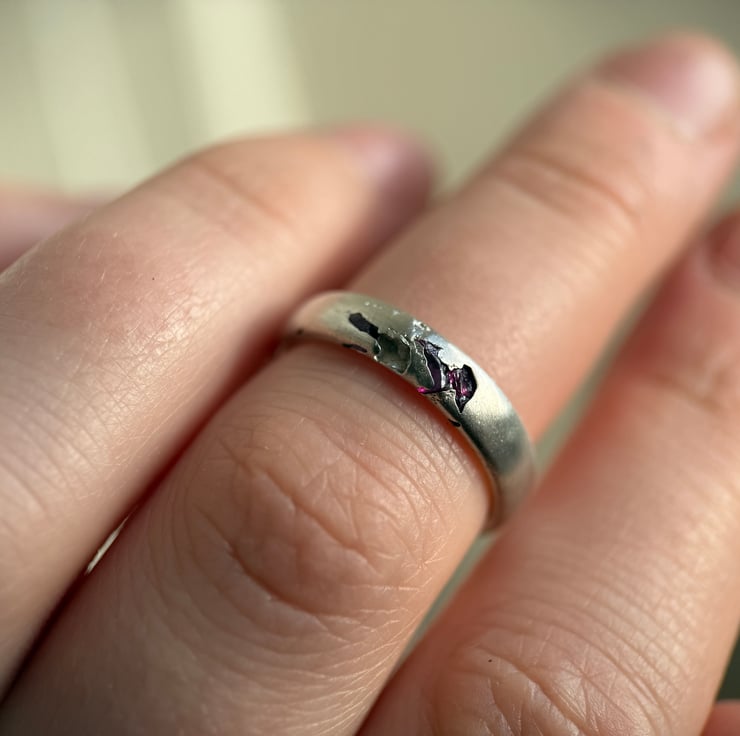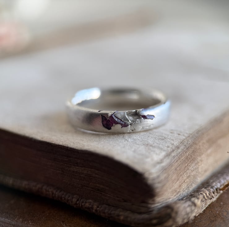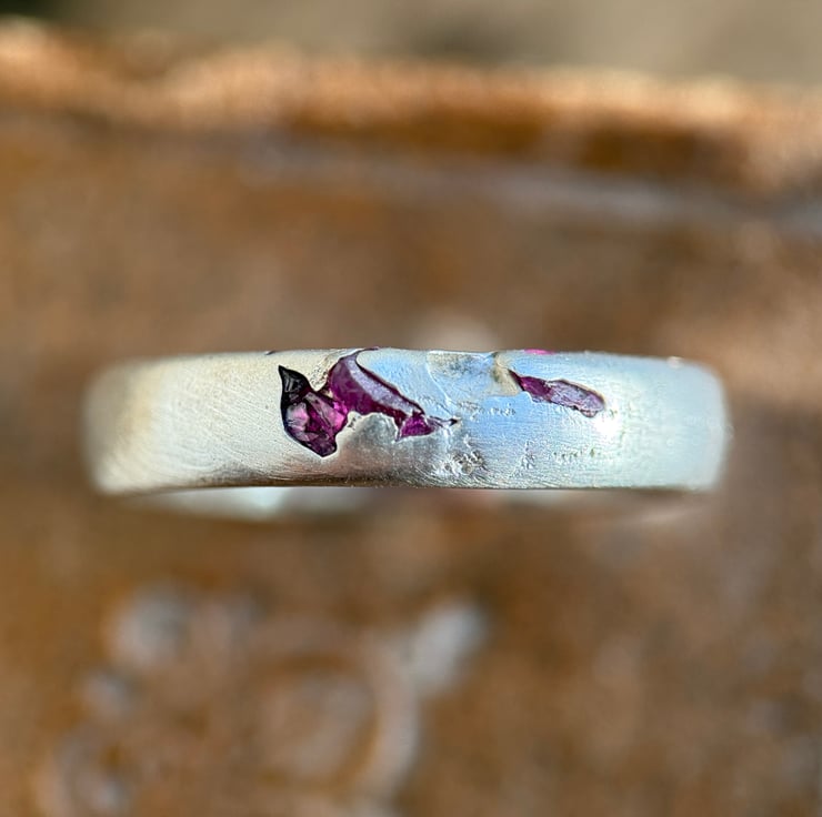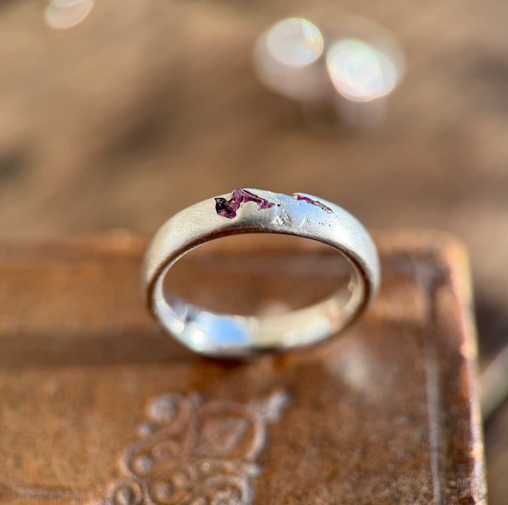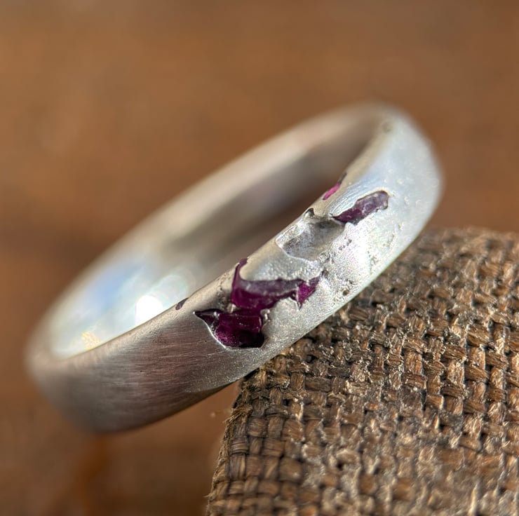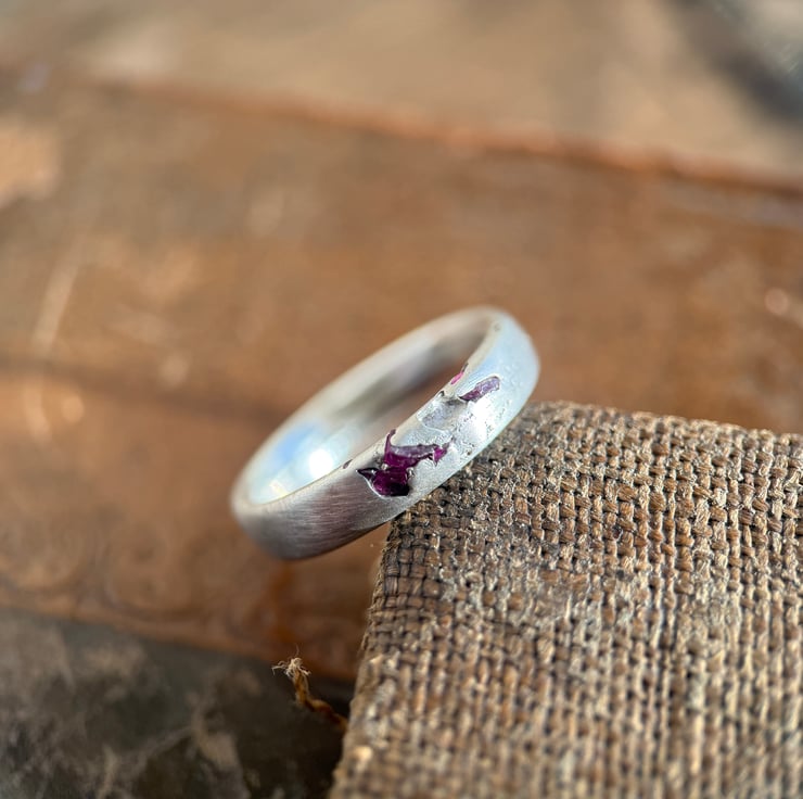 A one of a kind recycled Sterling silver ruby ring, sand cast with natural rough rubies cast directly into the organic, oval shaped silver band.