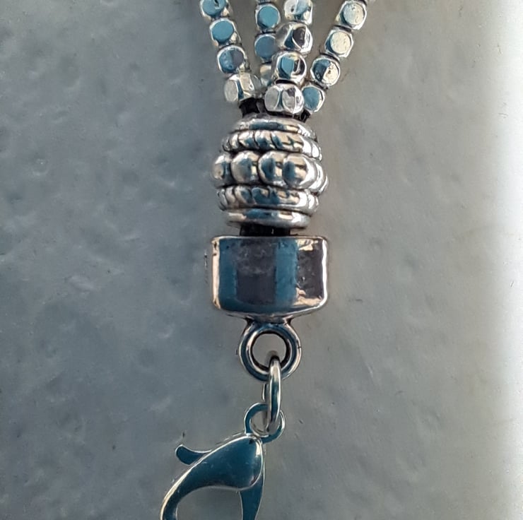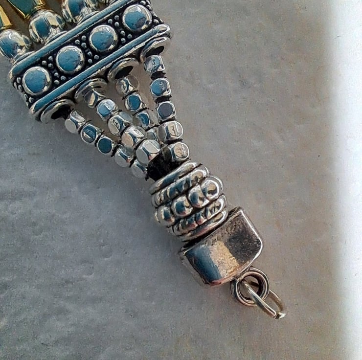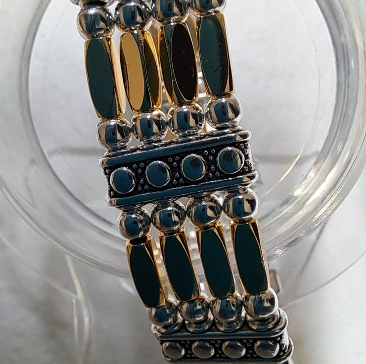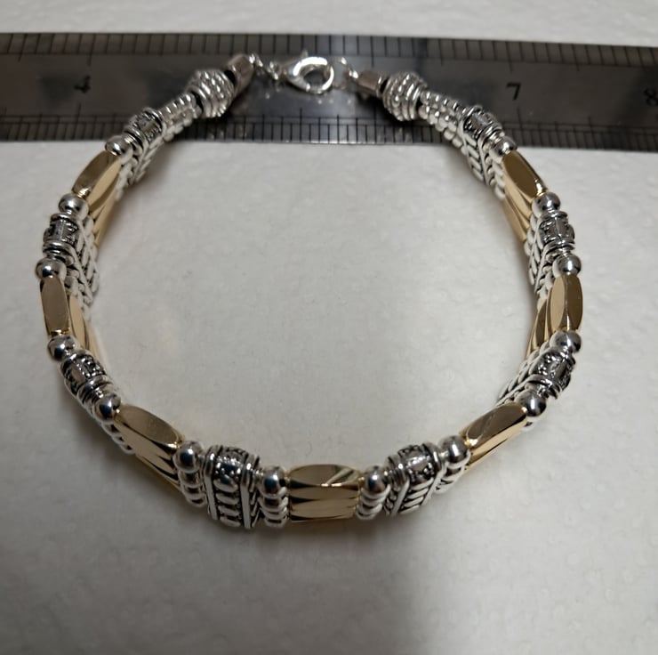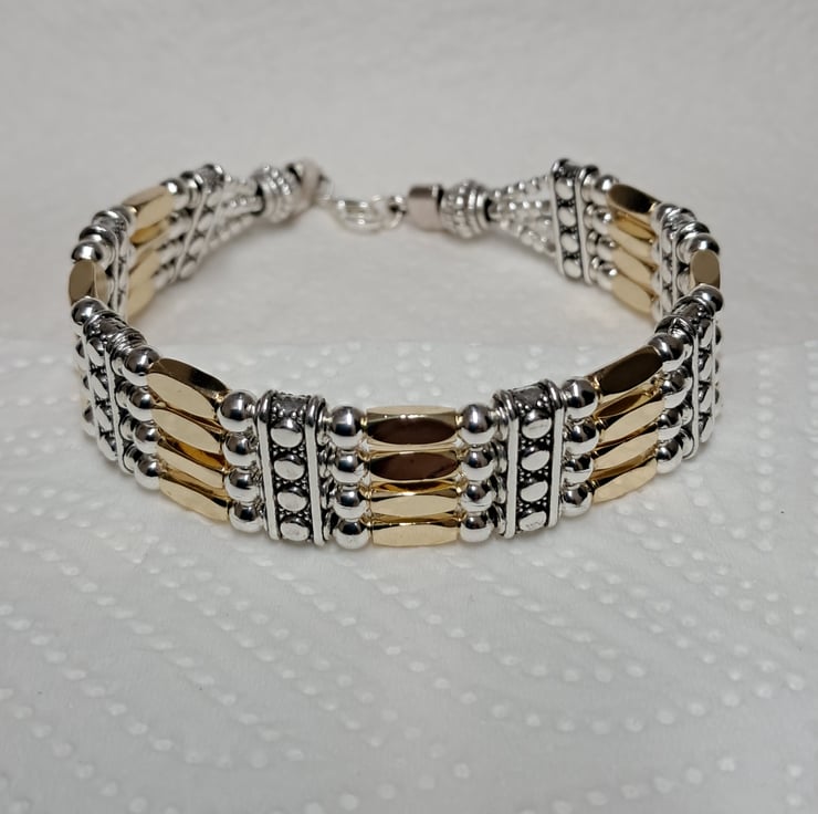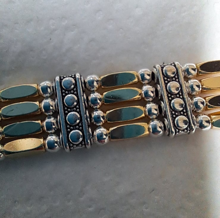 Leather 4 strand Gold and silvertone Gate bracelet. With 3mm silvertone beads, Includes 24 14ct Gold Plated 10mm tube beads, and 15mm 4 strand spacers, all strung on four 1mm.strands of leather. Lobster claw fastener. Handmade. Will fit up to 8" wrist. Thankyou for looking. Lori