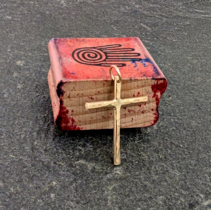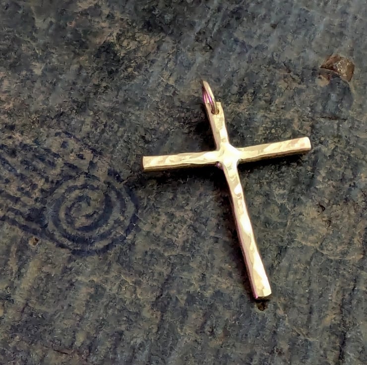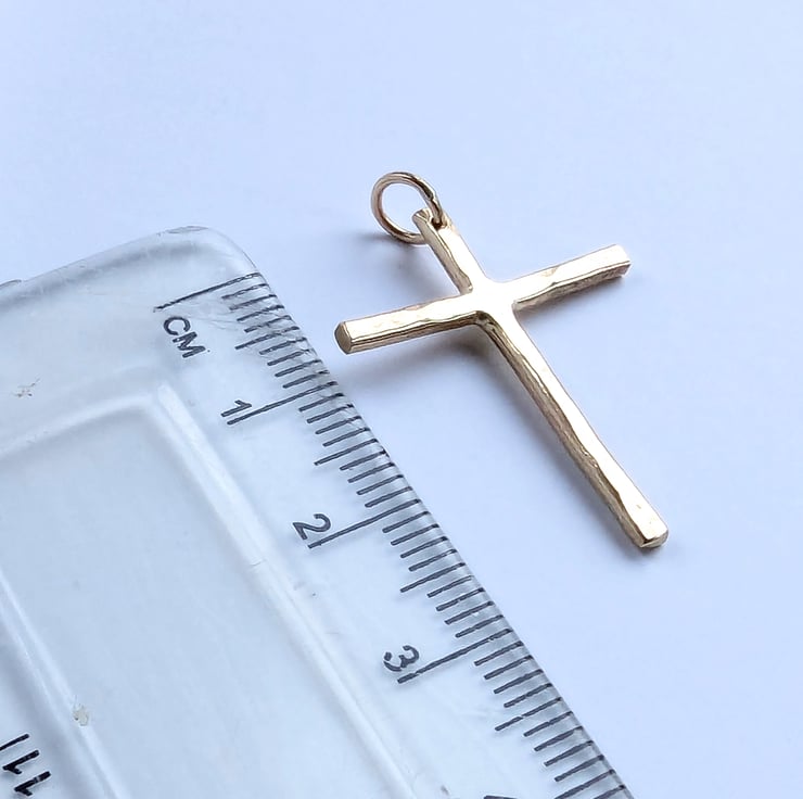 Small handmade gold cross, hammered texture.