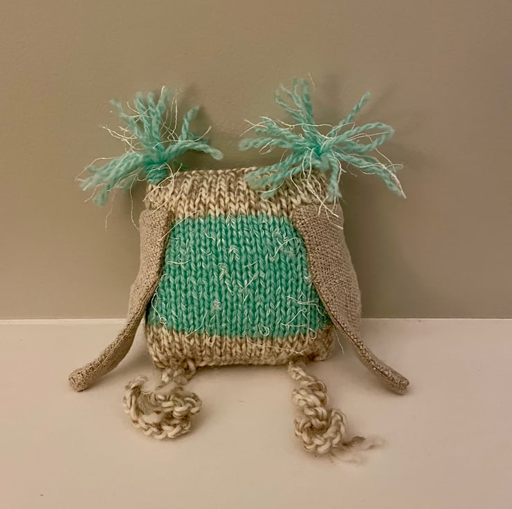 This lovely owl is hand knitted and hand stitched, finished off with cotton fabric wings and button eyes. The owl is based on square 10 x 10cm.