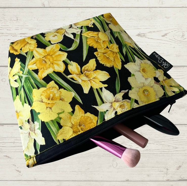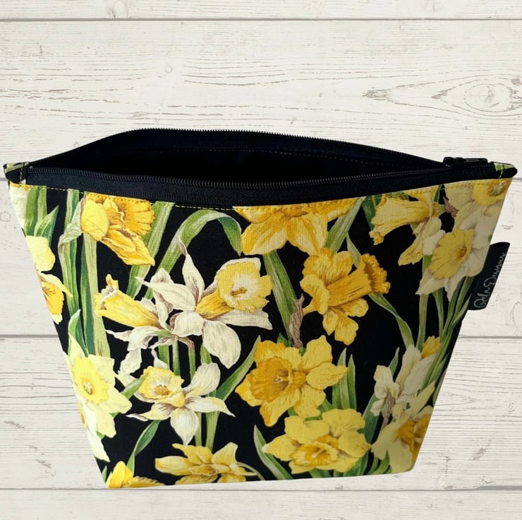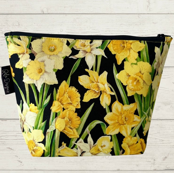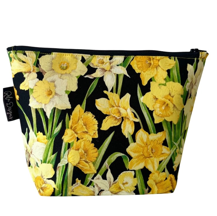 This cotton zip pouch features daffodils on a black background and has a black nylon waterproof lining. Carefully sewn and neatly finished with a sturdy zip, it’s just the right size for makeup, toiletries, or everyday odds and ends.