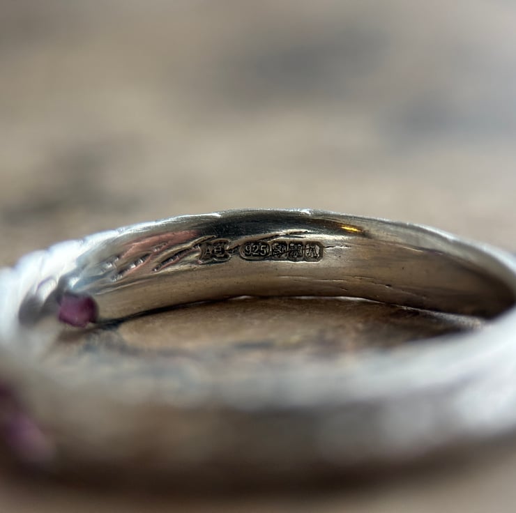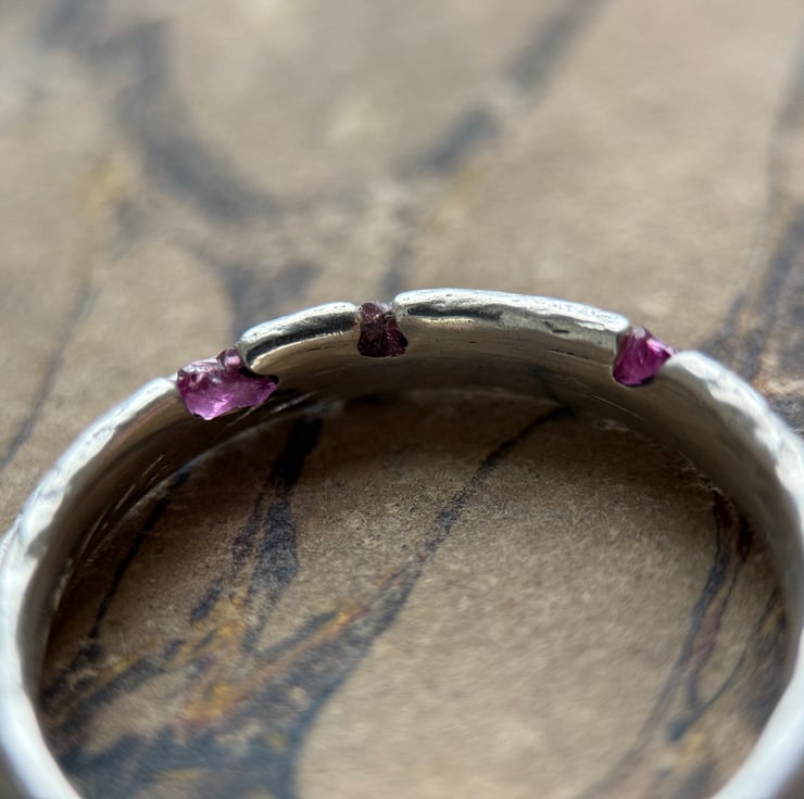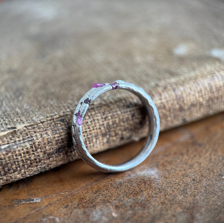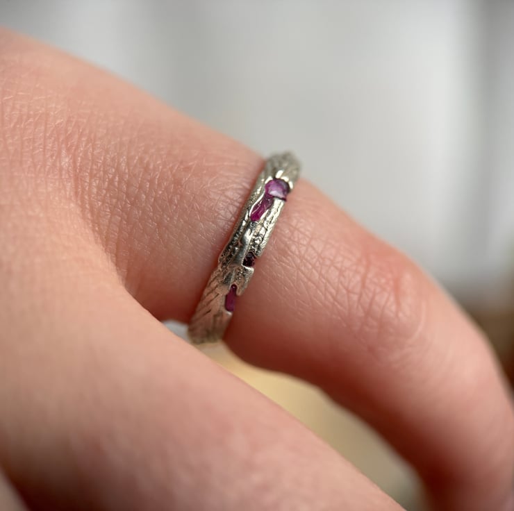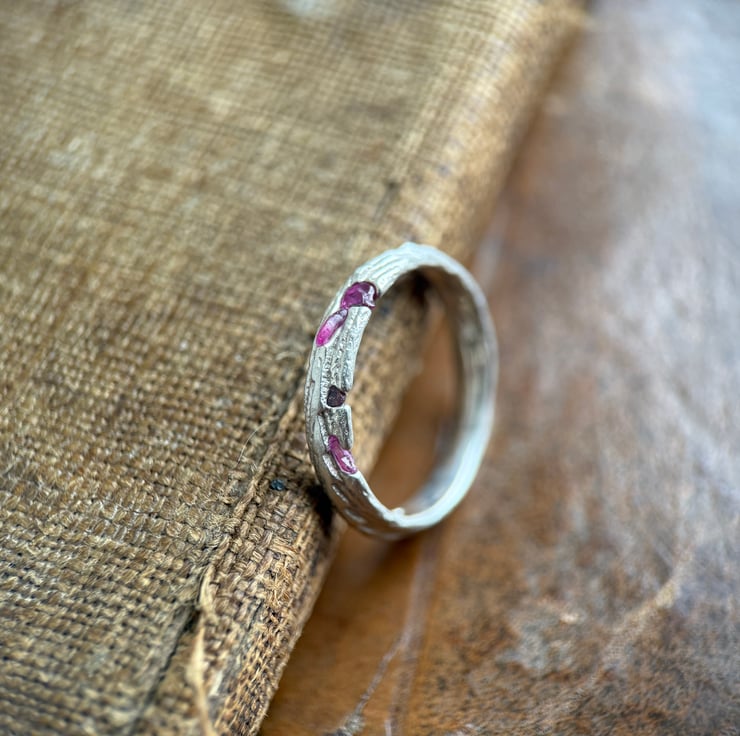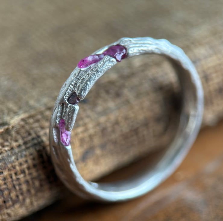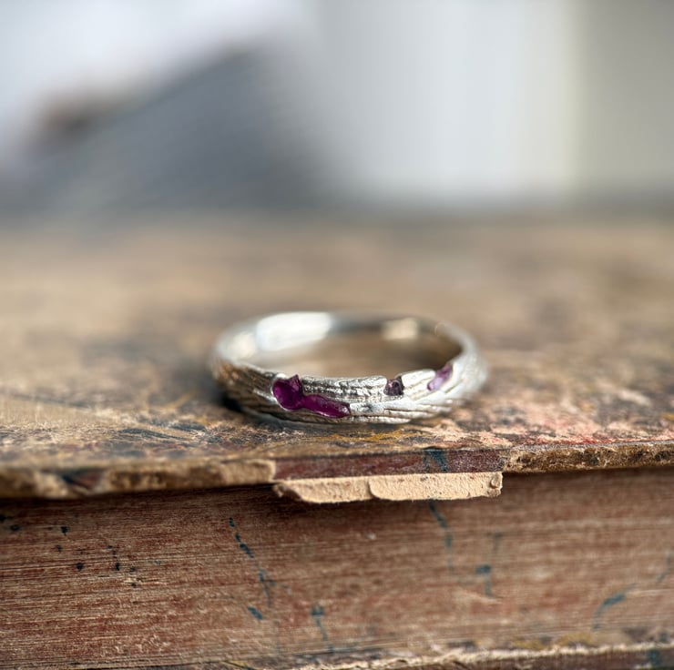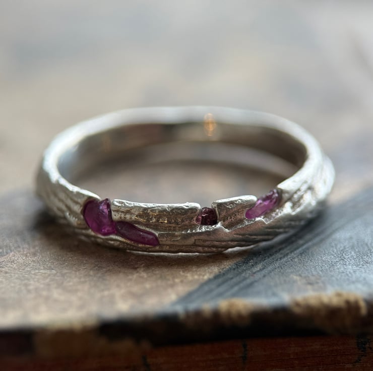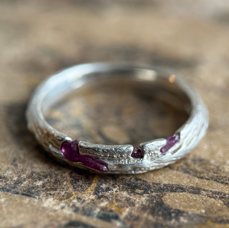 A one of a kind recycled Sterling silver ruby ring, Cuttle fish bone cast with natural rough rubies cast directly into the organic, D shaped silver band.