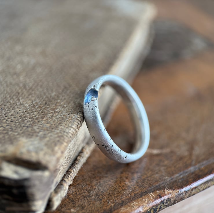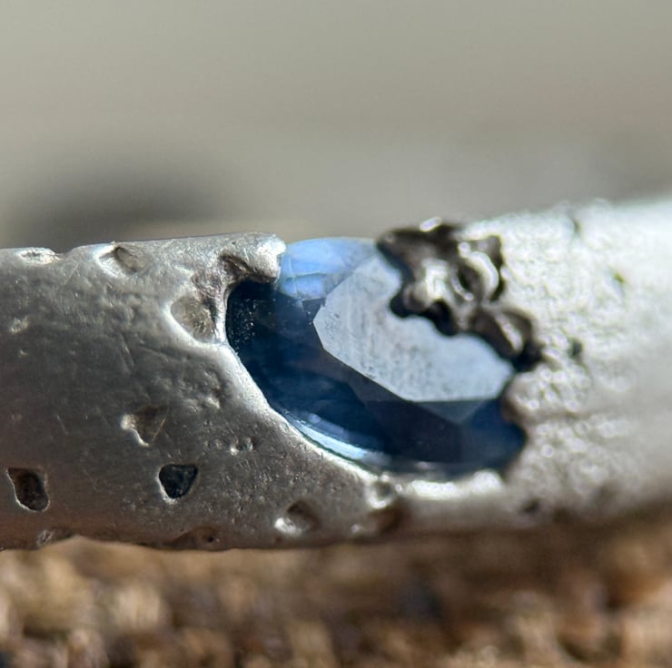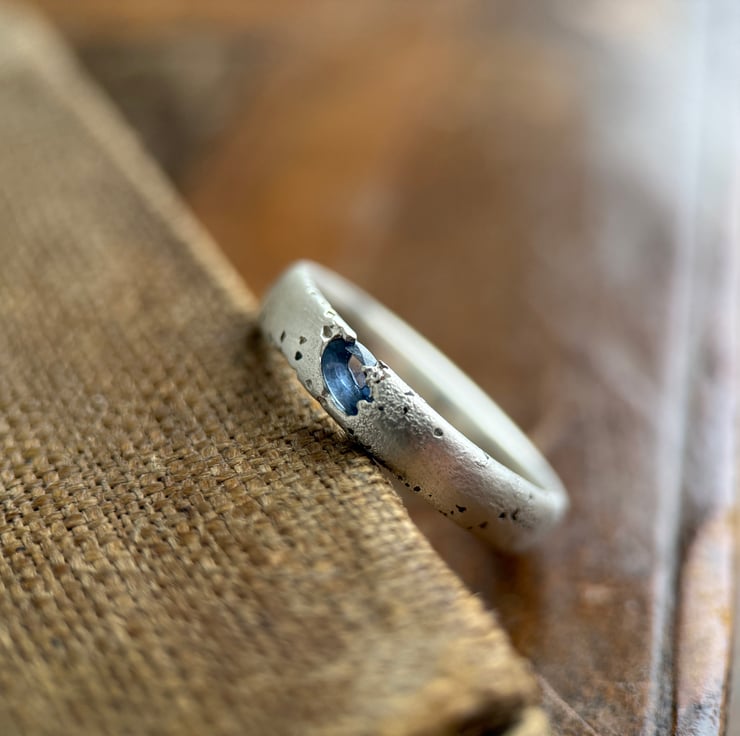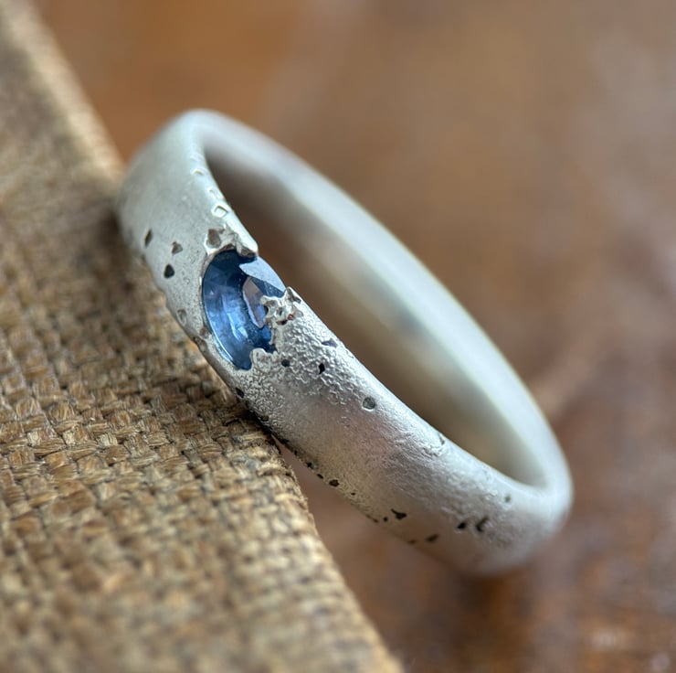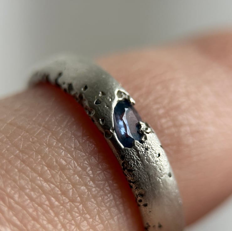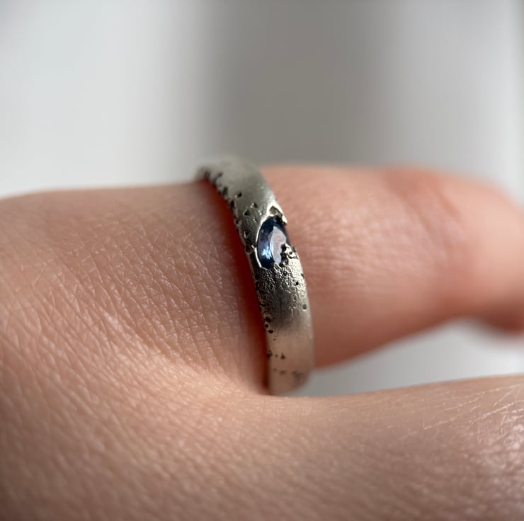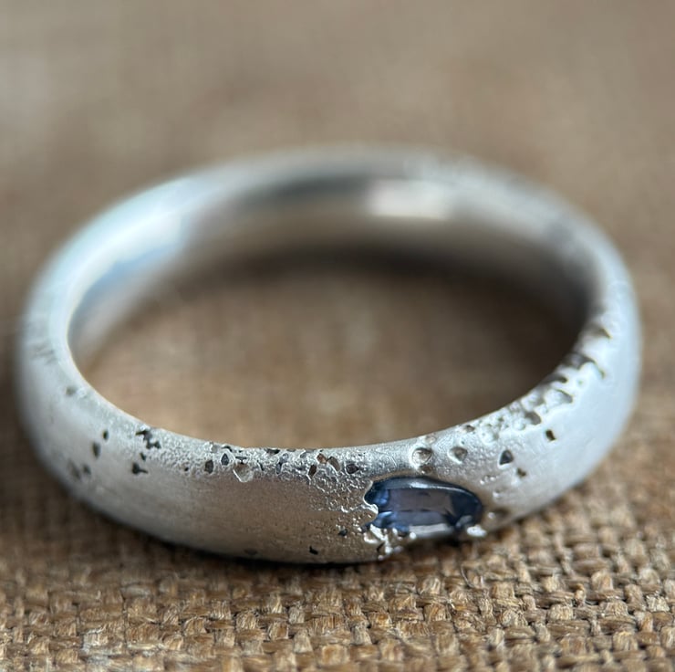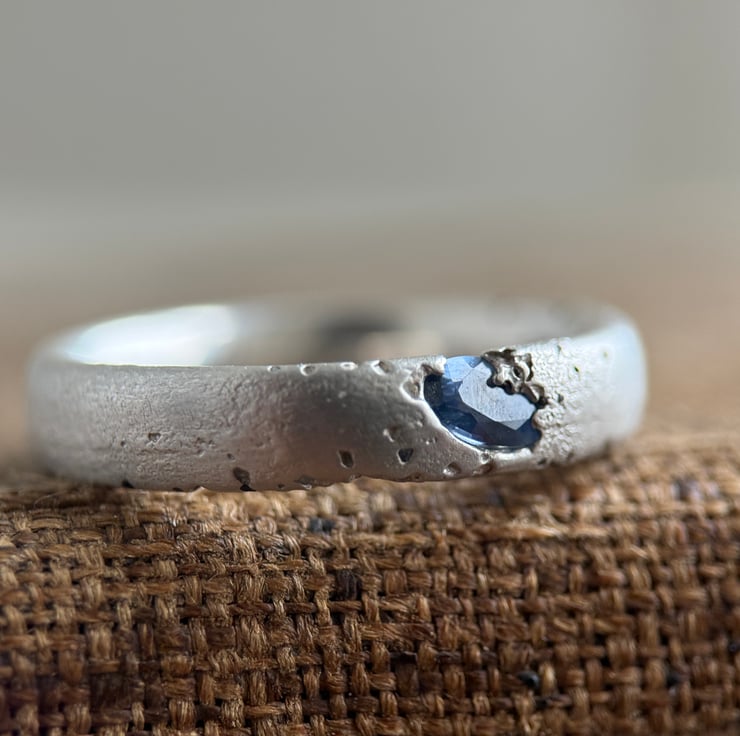 A one of a kind recycled Sterling silver sapphire ring, sand cast with a natural tanzanite gem cast directly into the organic, oval shaped silver band.