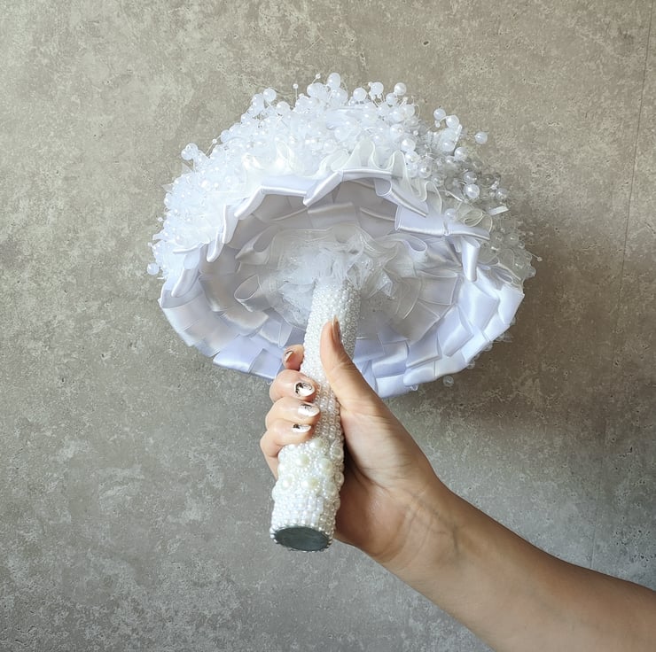 Unique White Satin Roses & Pearl Bridal Large Wedding Bouquet