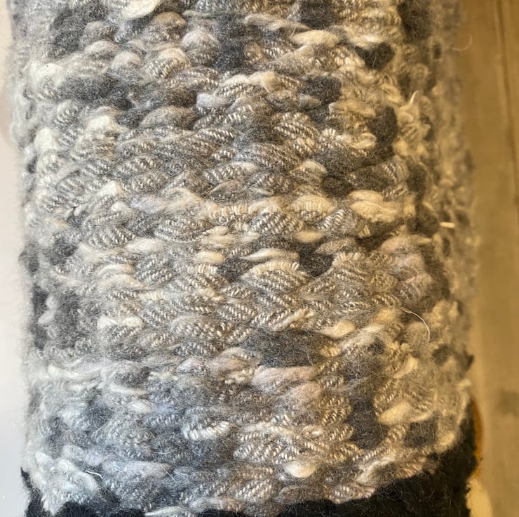 This is fabulously thick rug, ideal for a shower or bath mat, made from wool blanket selvedge fabric. Selvedge is the edges of the fabric cut off from when they have woven the wool fabric, this used to be thrown away, but now people are finding other uses for it. I've woven this on my old fashioned peg loom and turned it into a one of a kind rug.