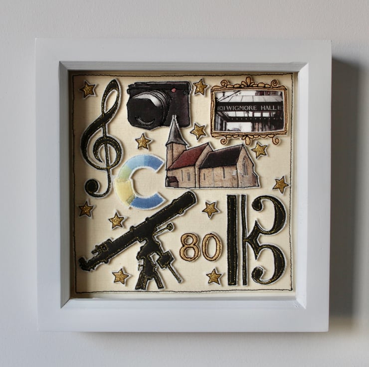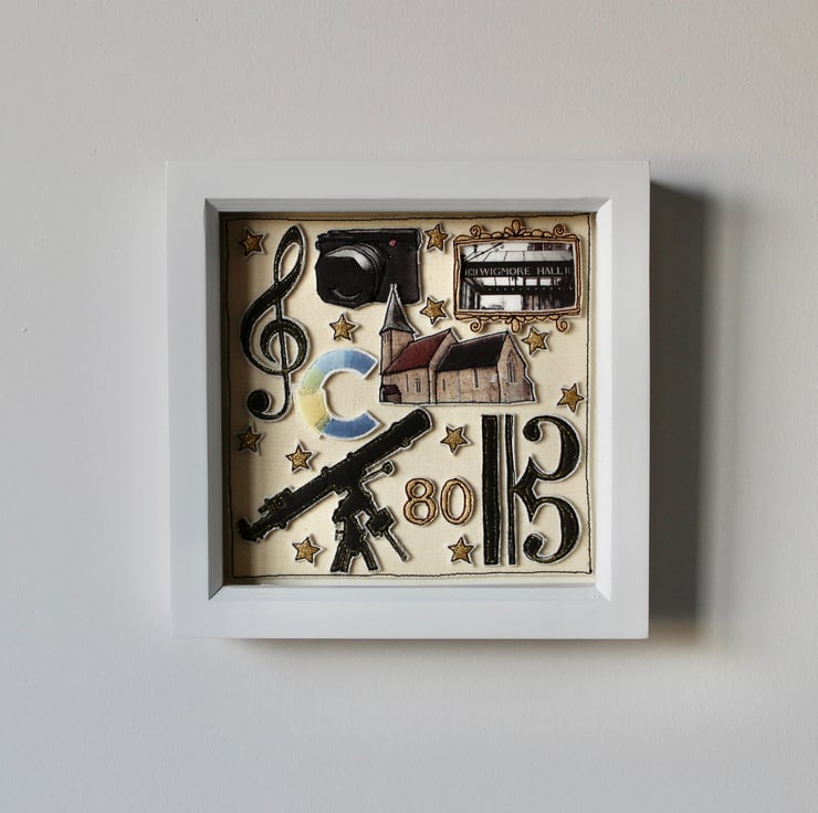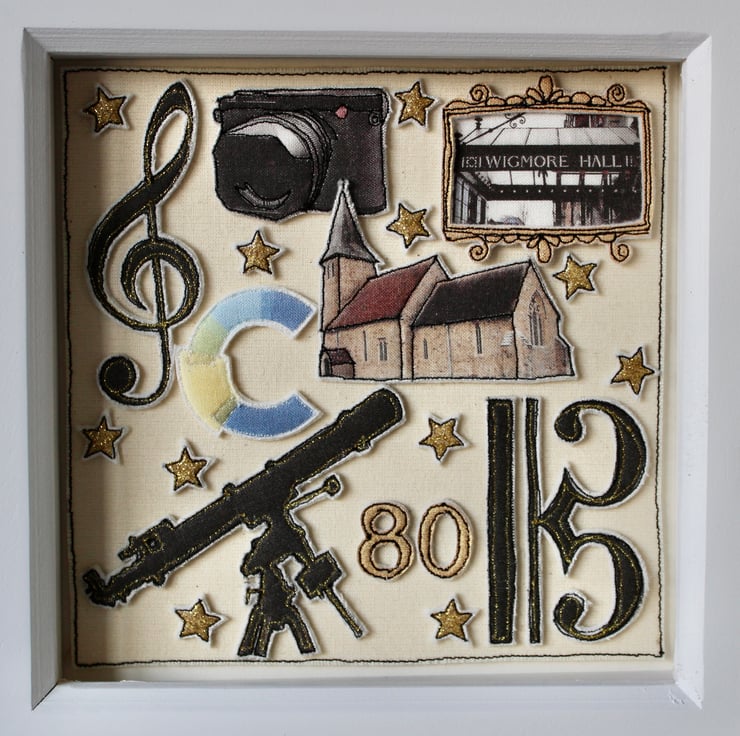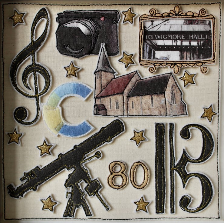 All the elements within this picture are created using layers of cloth and free hand machine embroidery with each being cut out by hand using a very sharp pair of scissors.
