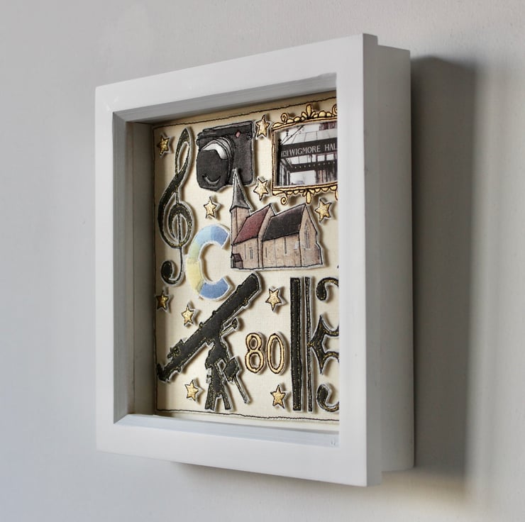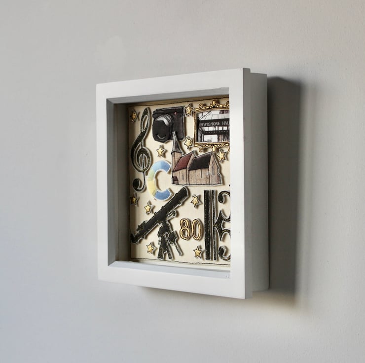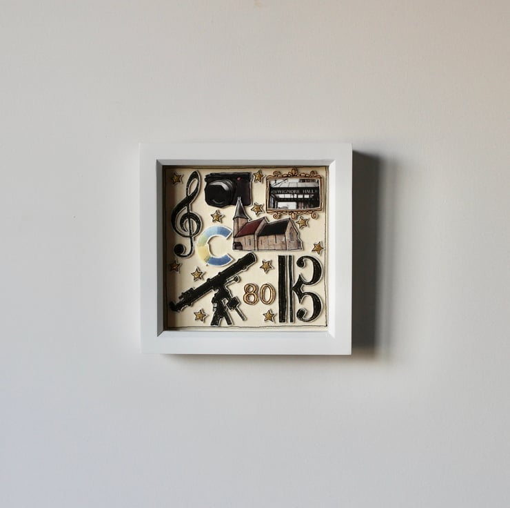 Encapsulated within a white washed box frame, measuring 19cm by 19cm.