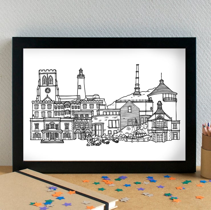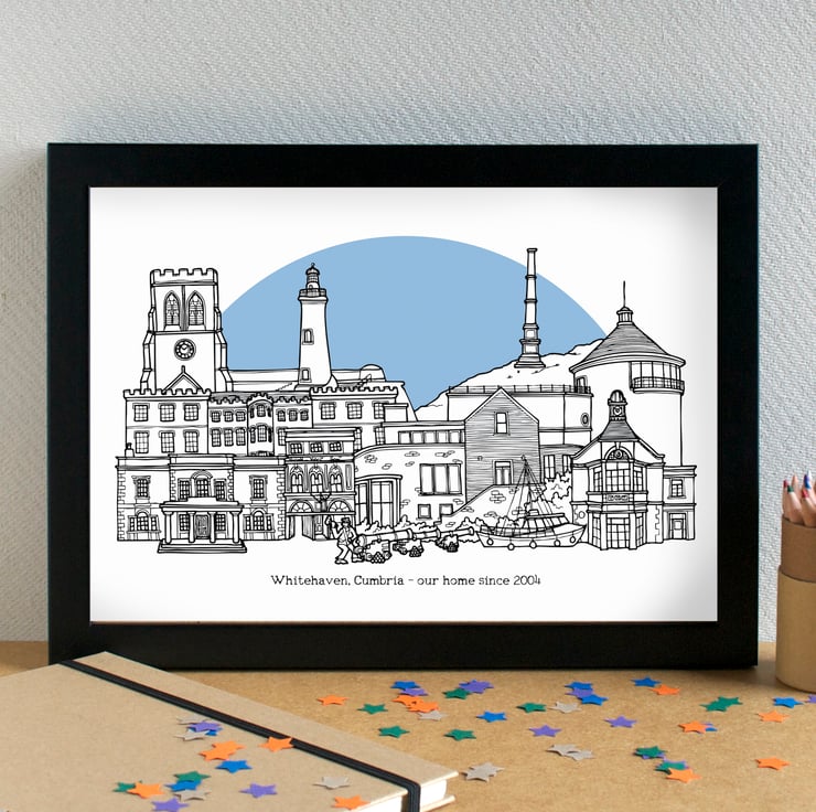 A stunning print of my line drawn illustration of the most famous landmarks in Whitehaven, Cumbria.
