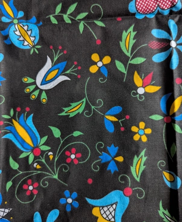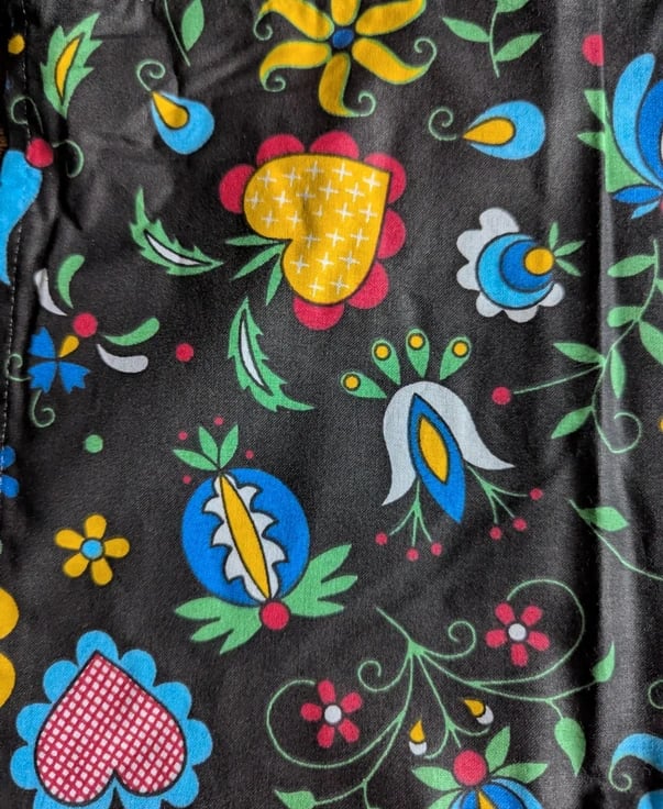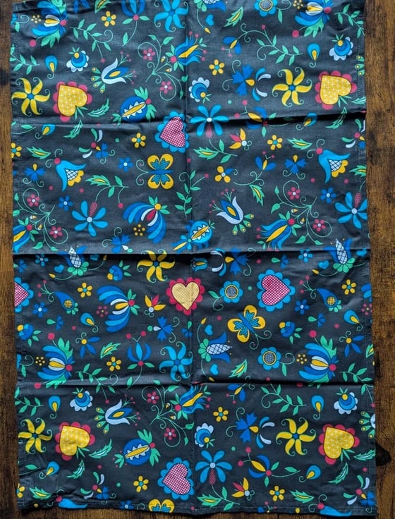 This is a beautiful and vibrant vintage Small tablecloth, tea towel or dish cloth handmade by Agira featuring a bright, busy folk art floral design. It’s perfect for adding a splash of retro colour and character to any kitchen!