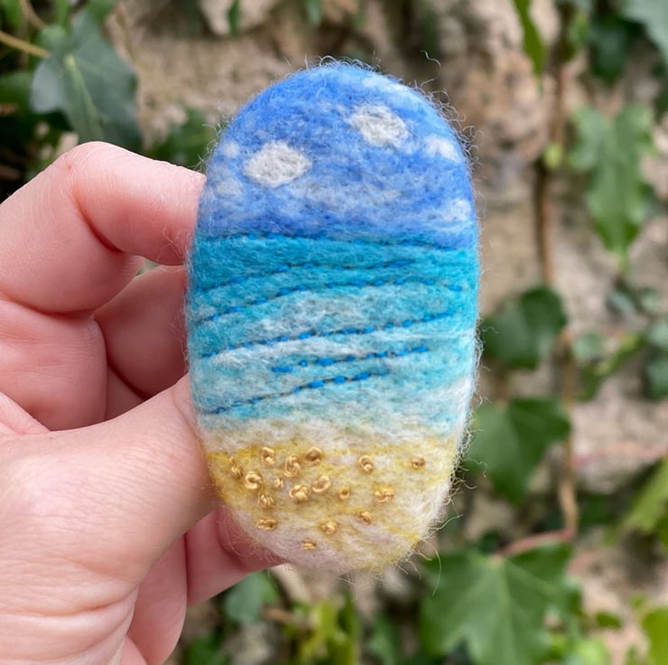 Details: Handmade needle felted brooch, Hand embroidered detailing, Cornwall coastal inspiration, Wool fibre with metal brooch pin.