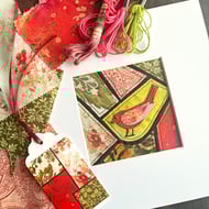 My background is in Graphic Design and although I'm now retired I still enjoy the creative process. A lot of my work features birds and flowers and I particularly love combining different materials and patterns to create colourful, one-of-a-kind mixed media pieces.