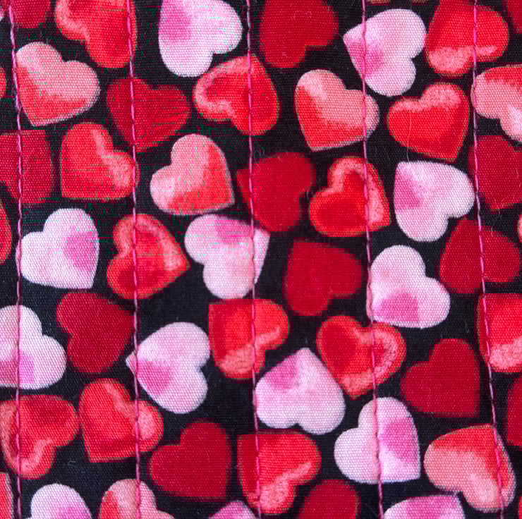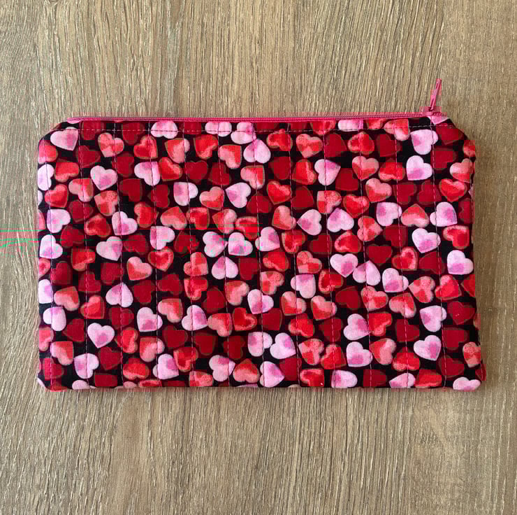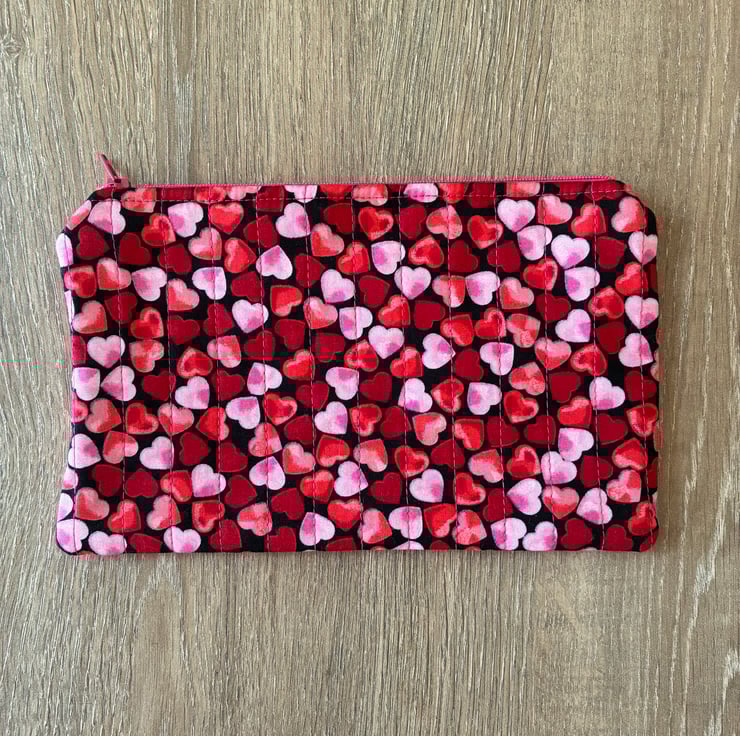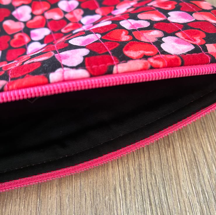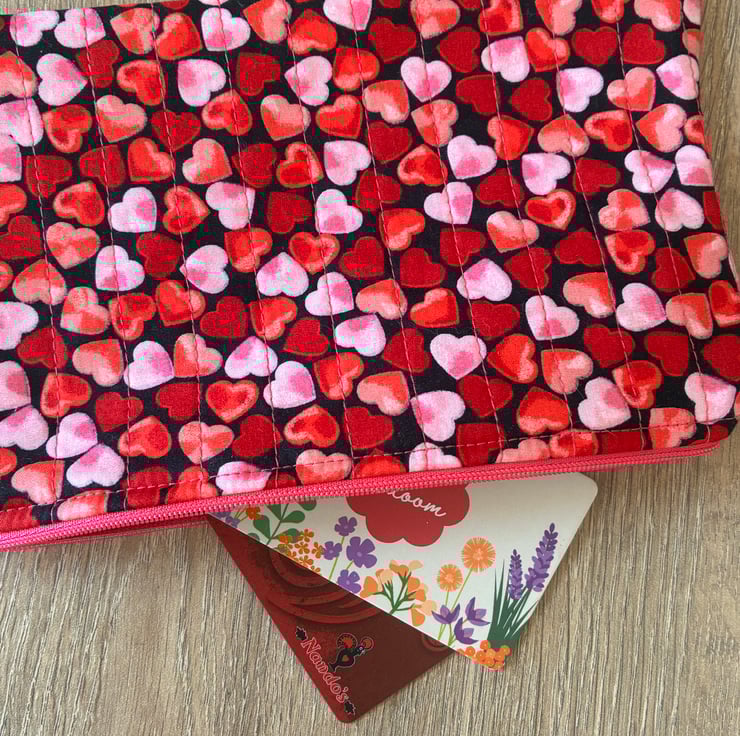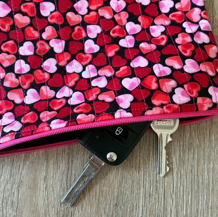 The pouch is made in this lovely hearts print cotton fabric and is quilted with pink stitching.