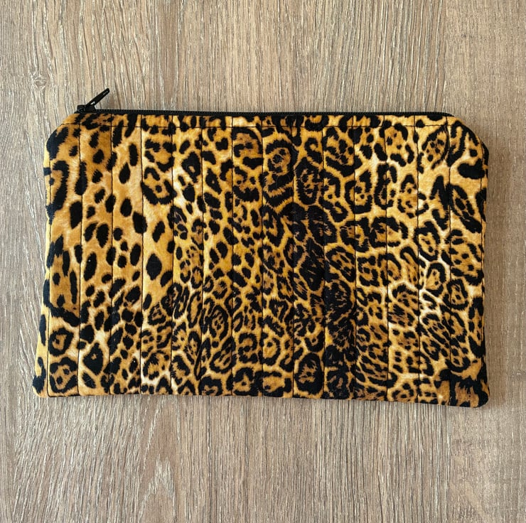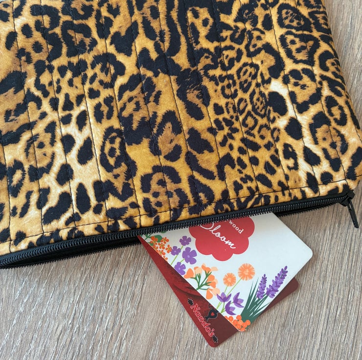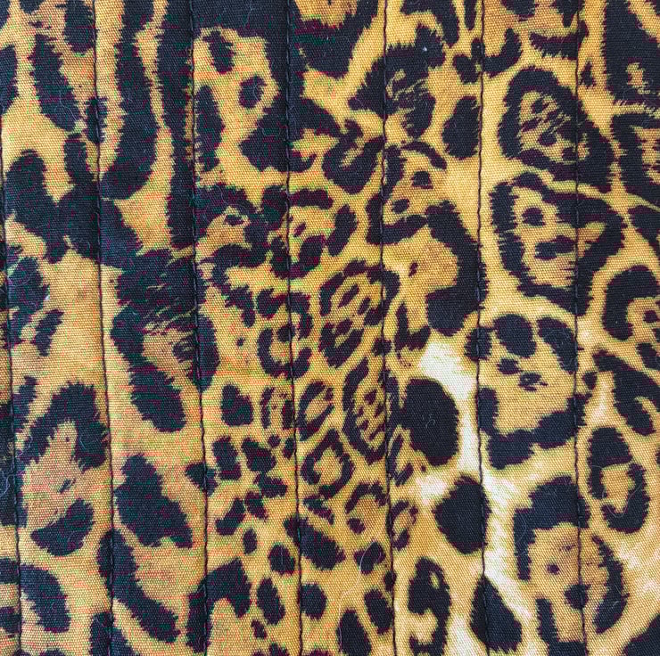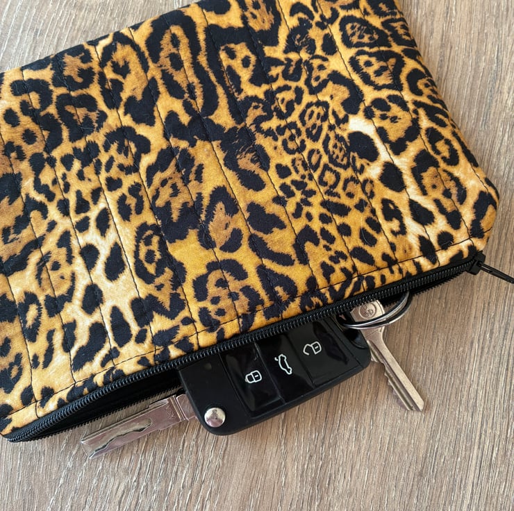 The pouch is made in this lovely animal print cotton fabric and is quilted with black stitching.