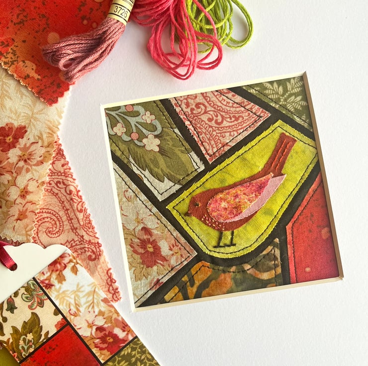 It has been made using a mixture of cotton fabrics cut and arranged in the style of a mosaic. I've added a colourful wing and embroidery threads to the folk bird to add interest and texture.