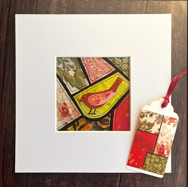 A pretty little textile bird picture in a palette of soft pinks and greens. It would make a lovely Valntine gift or present for a bird lover.