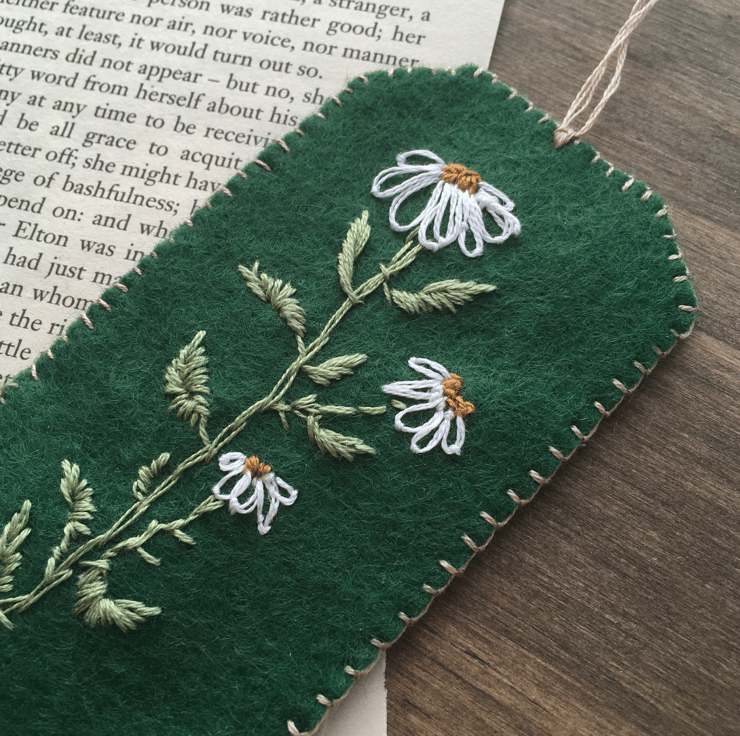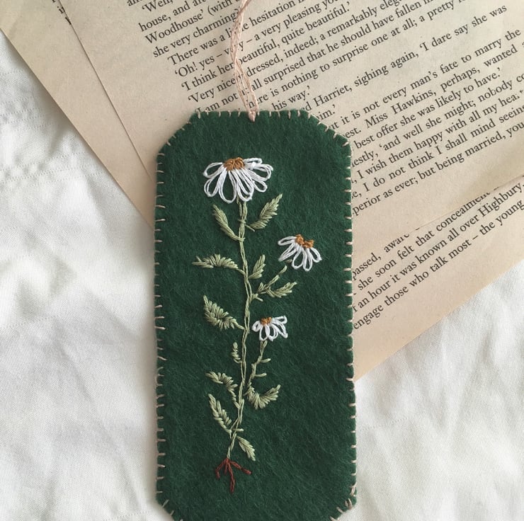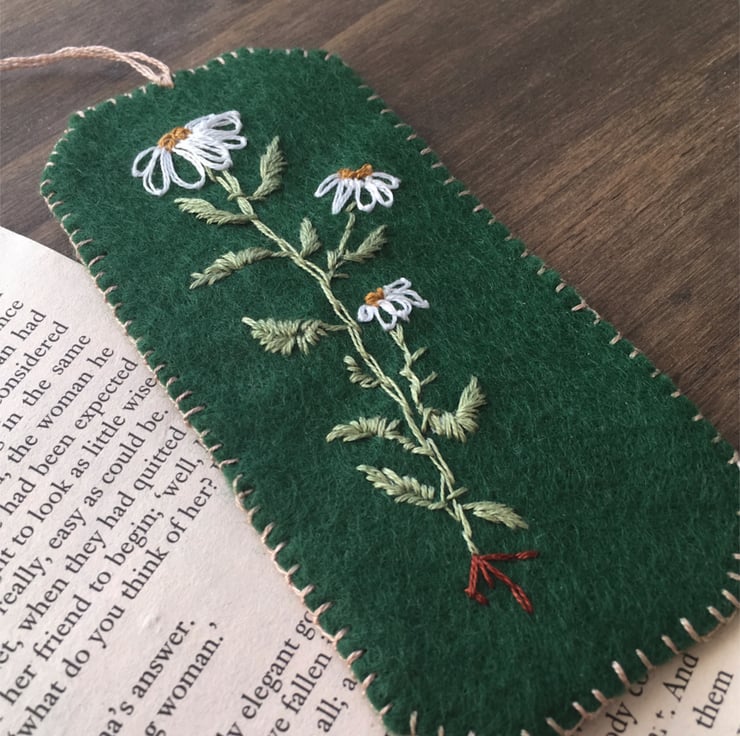 A hand-embroidered bookmark of a daisy flower. Created using DMC embroidery threads on green craft felt.
