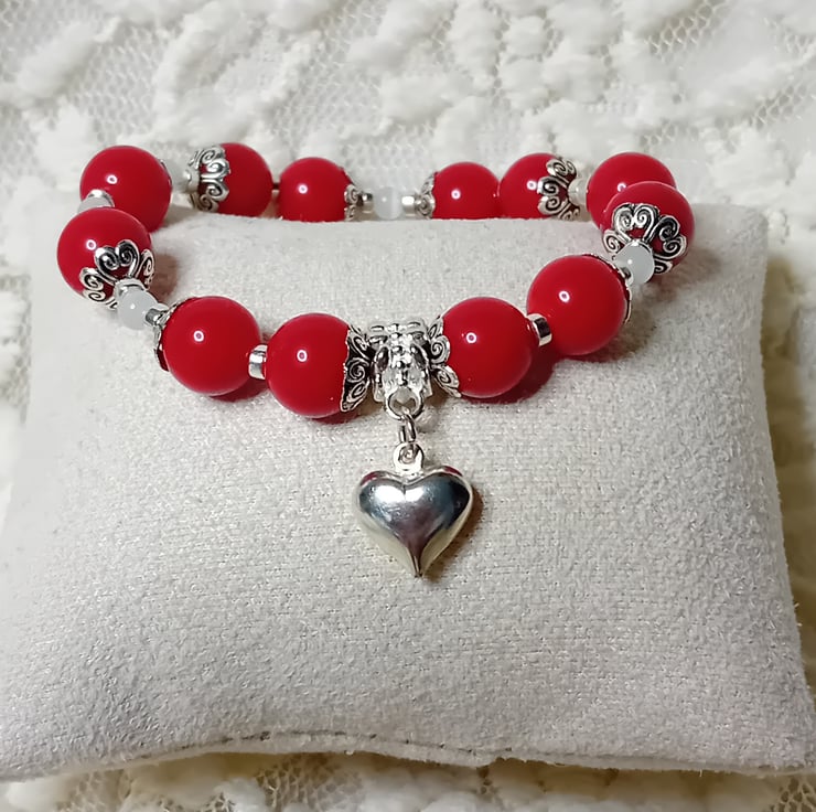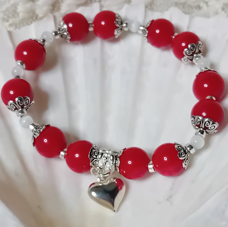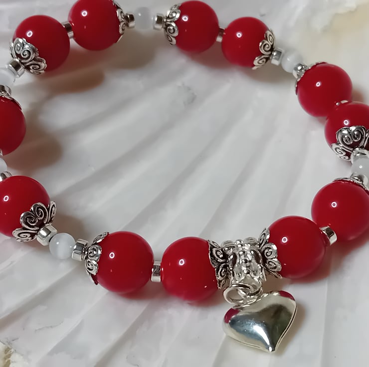 This gorgeous Red Coral measures 8mm and it is mixed with 3mm Selenite with Silver Hematite and Tibetan Silver carved hearts bead caps.The focal point is a lovely puffed Heart charm. Combined all together to make this bracelet. Sized just for you.