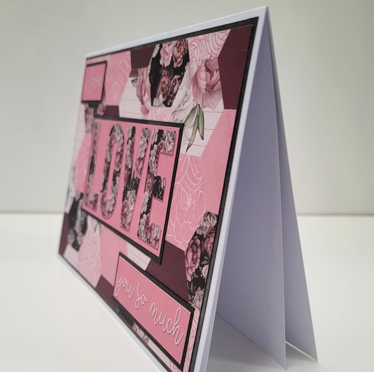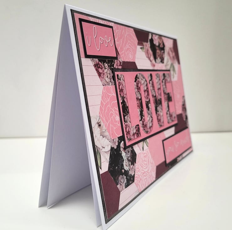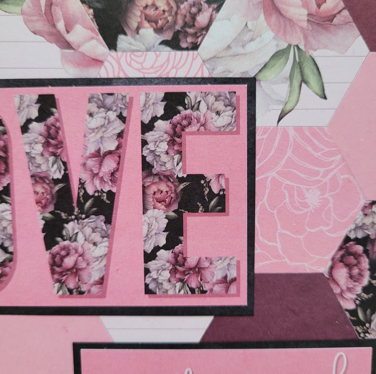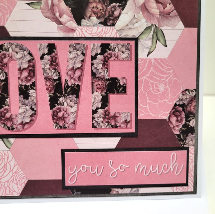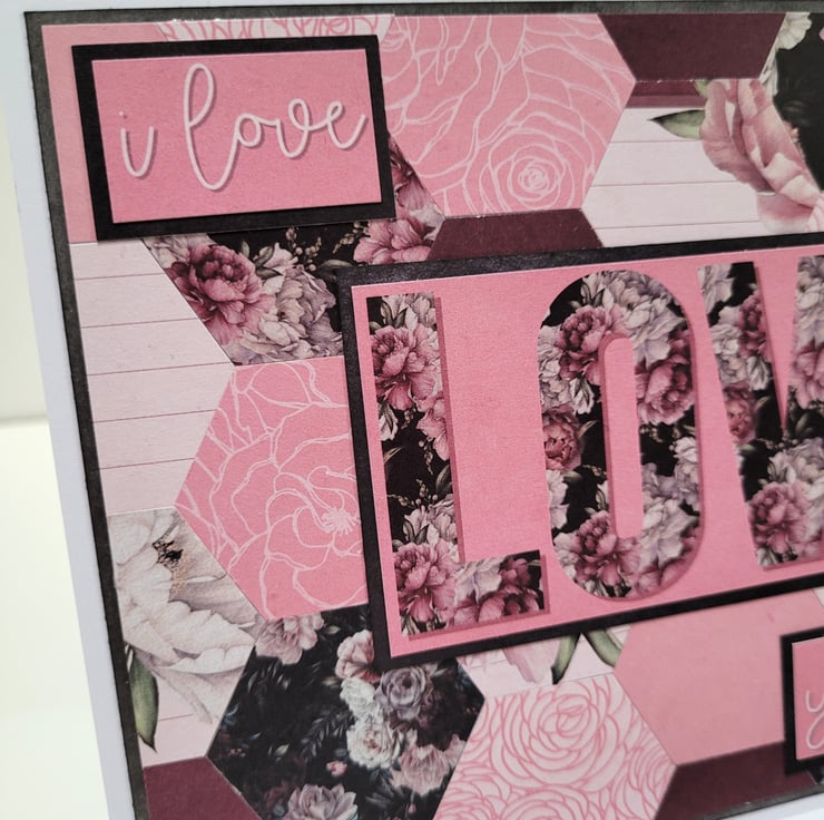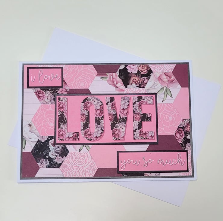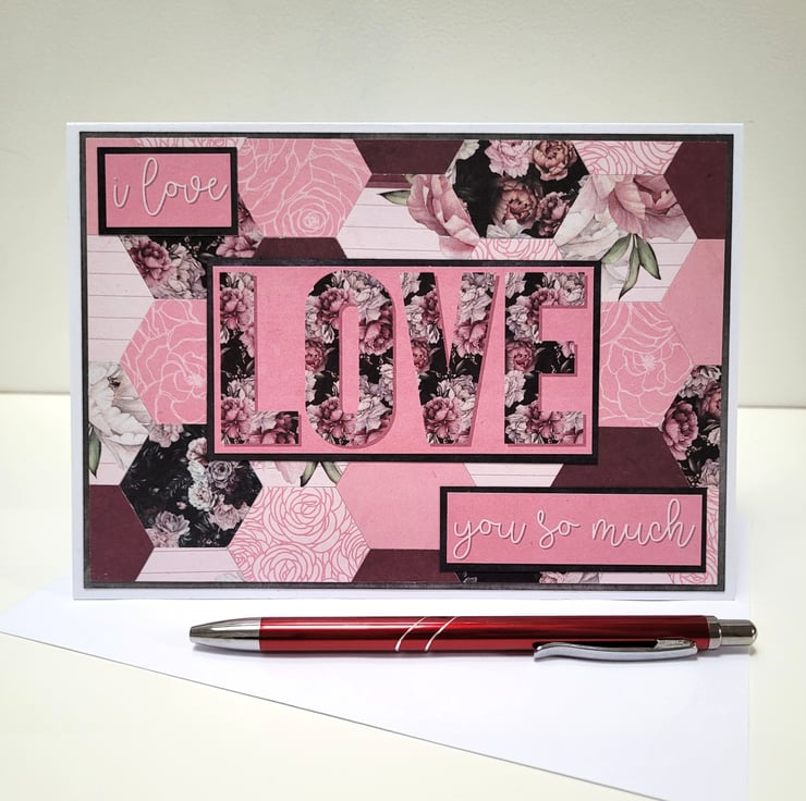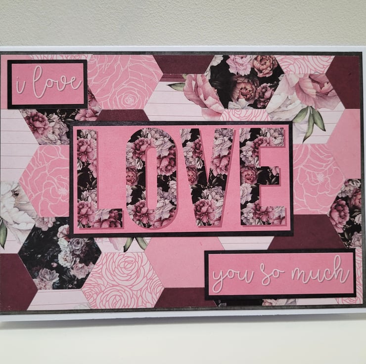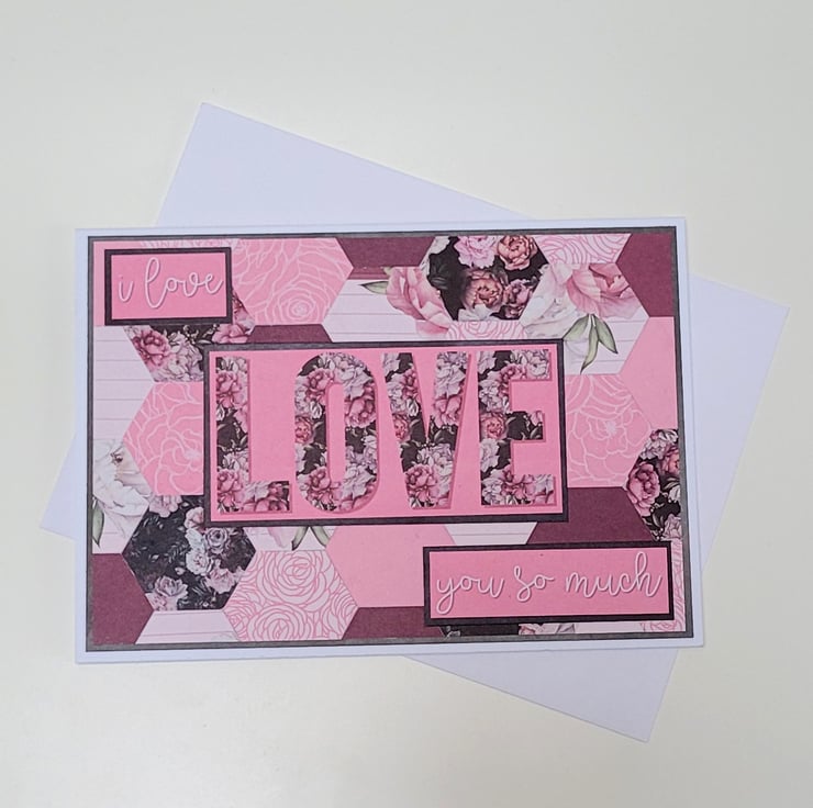 A beautiful floral card featuring a background which has been created using over 30 individual hexagons cut from coordinating patterned card, and finished off with simple but heartfelt sentiments of Love.