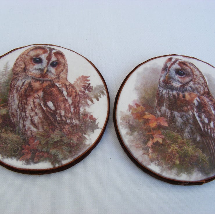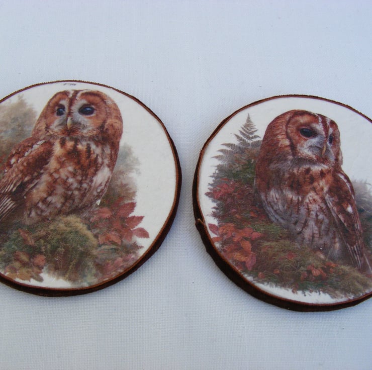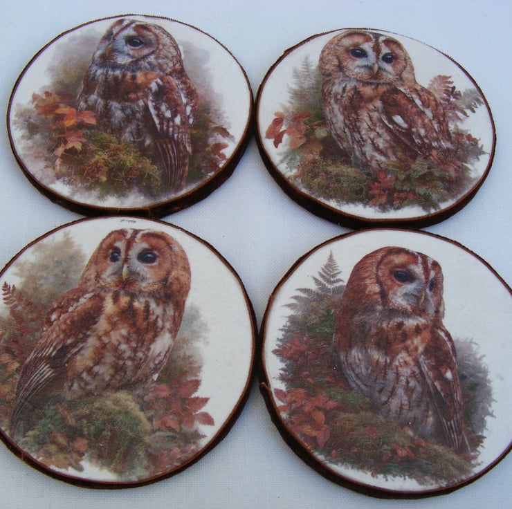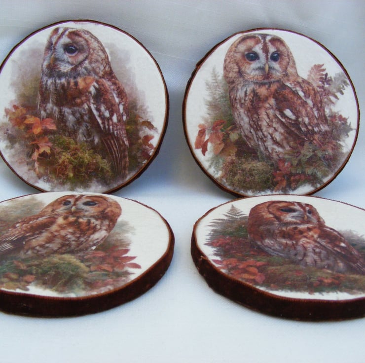 I've handmade these lovely owl coasters by decoupaging 4 round wooden coasters. Coasters have been varnished and sealed 3 times. Velvet ribbon is attached around the coasters and felt is glued to the bottom.