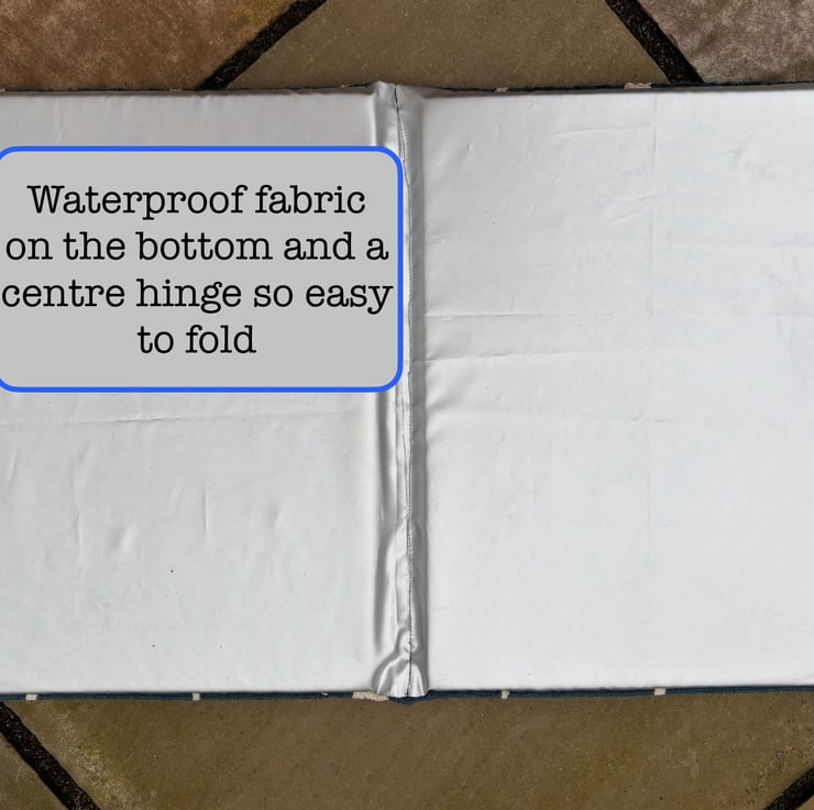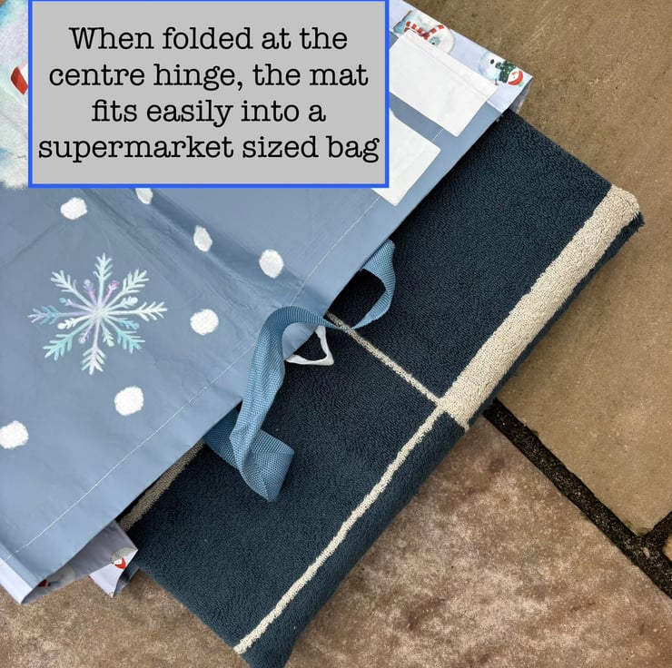 The mat folds at a centre hinge to pack easily into a supermarket sized bag.