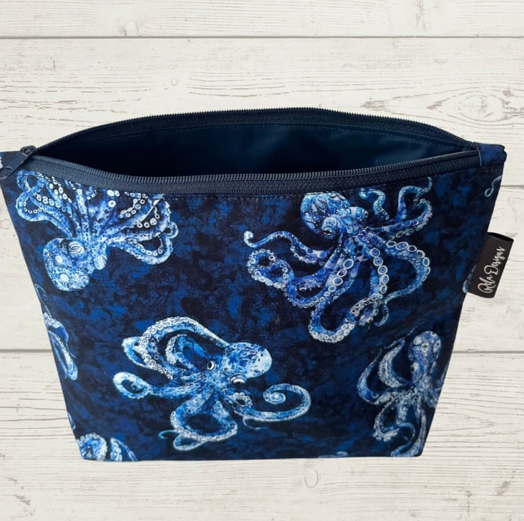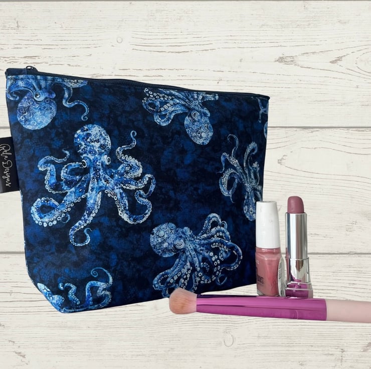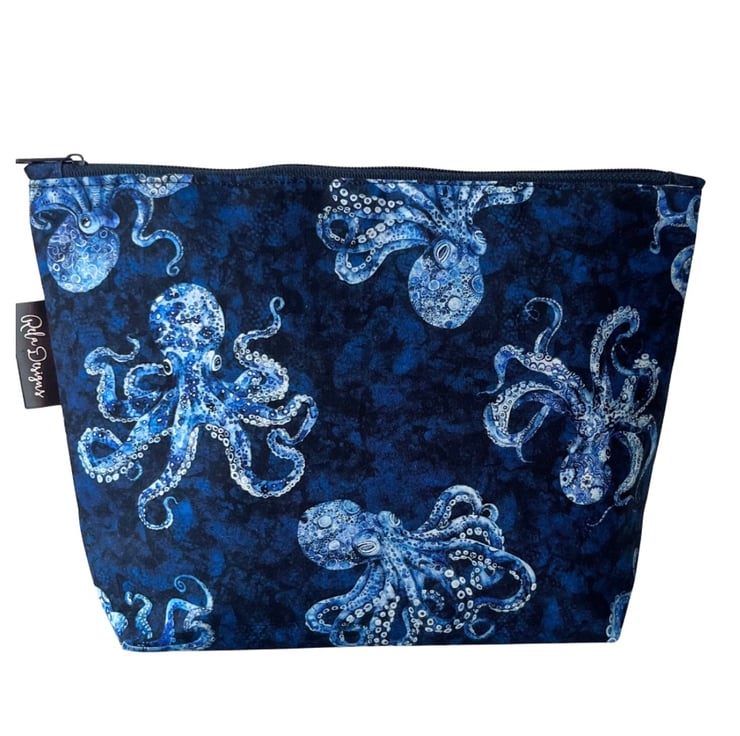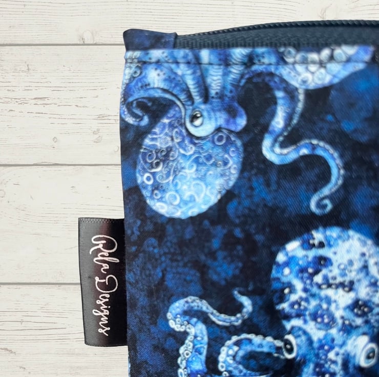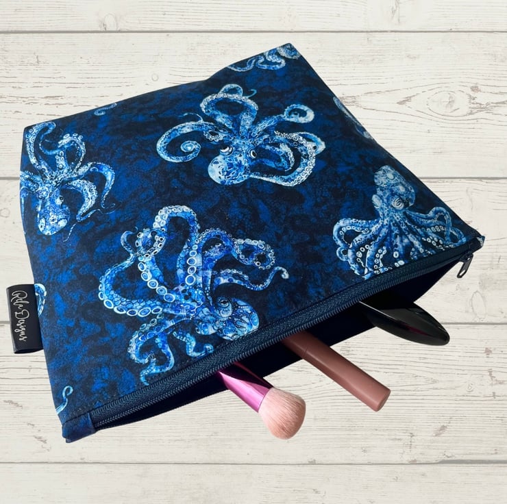 Add some colour to your everyday essentials with this charming zipped pouch, featuring a rich blue octopus print.
