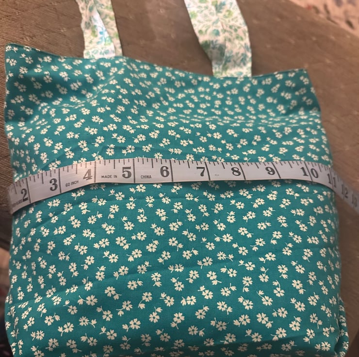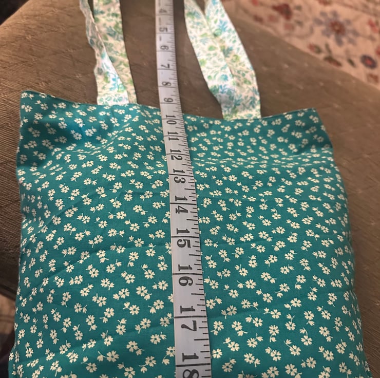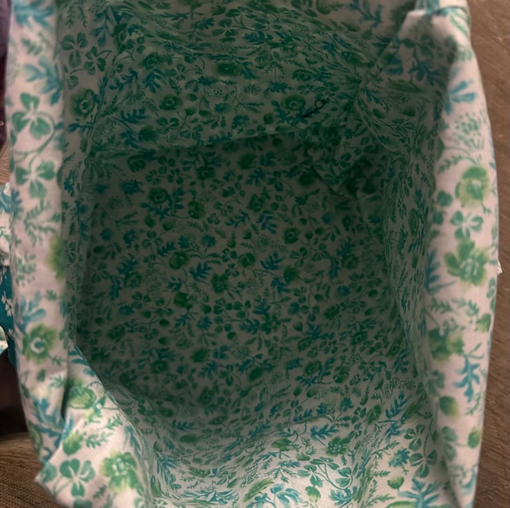 My lined, teal tote bag is made from washable, floral cotton.