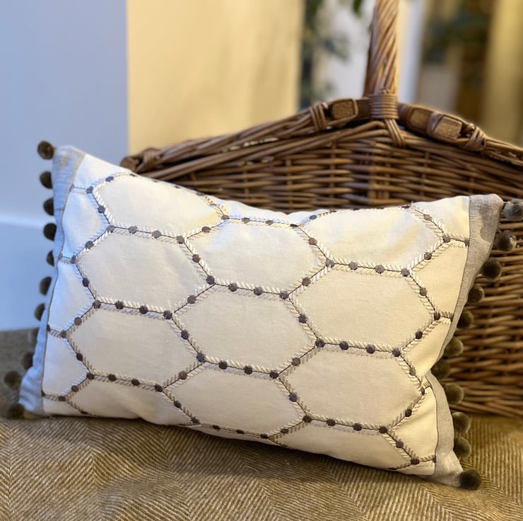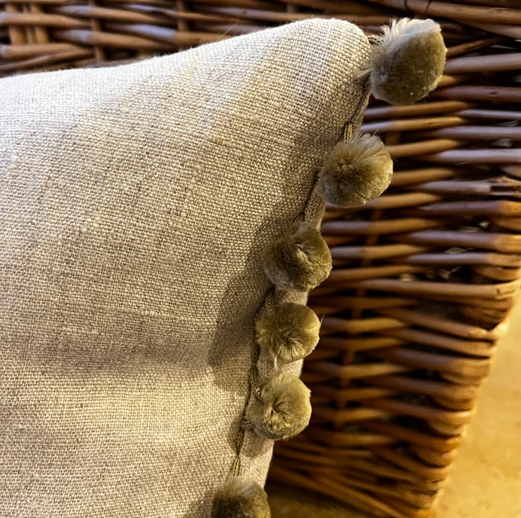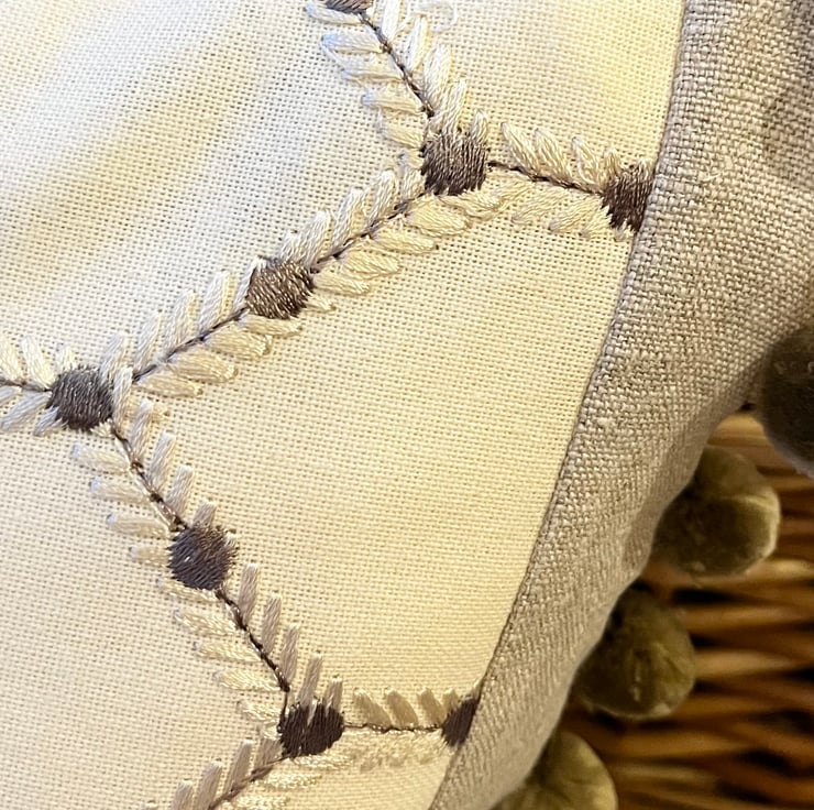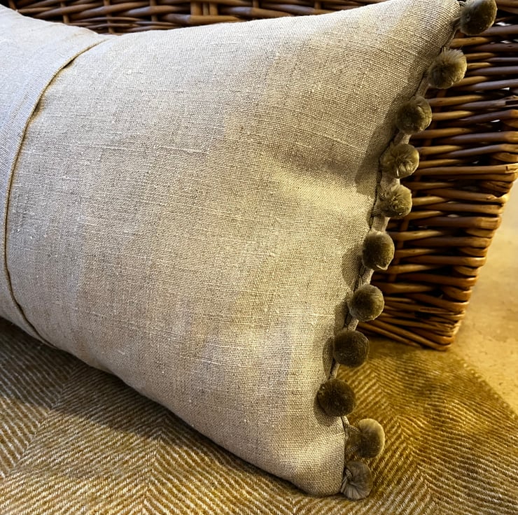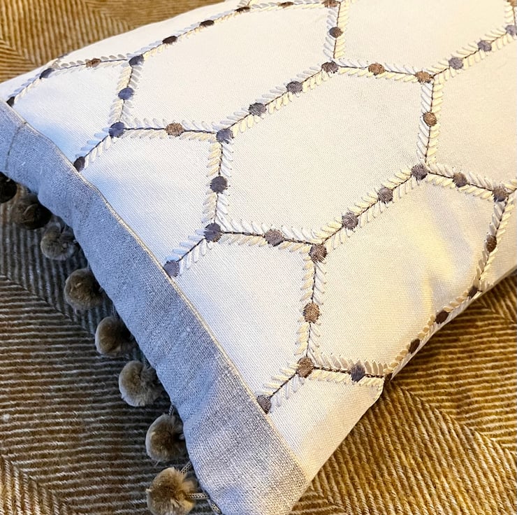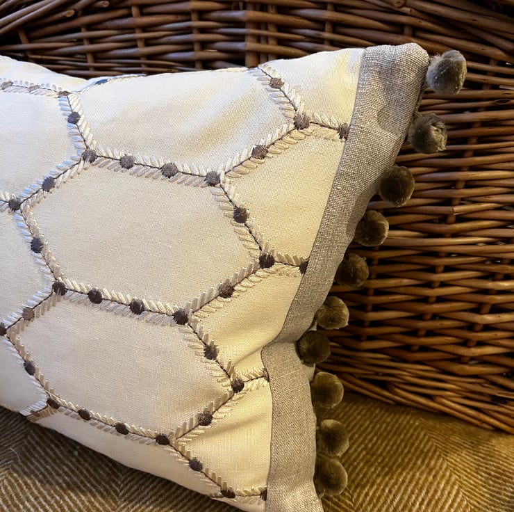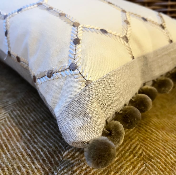 Pretty one of a kind rectangular cushion cover made from a sample swatch of embroidered cotton and natural beige linen reclaimed from curtains. The cover is trimmed with velvety pompoms and fastens with a concealed zip in the back.