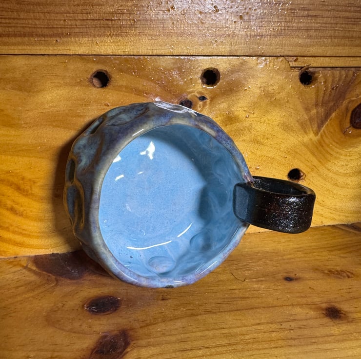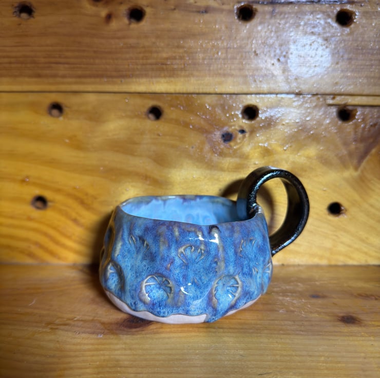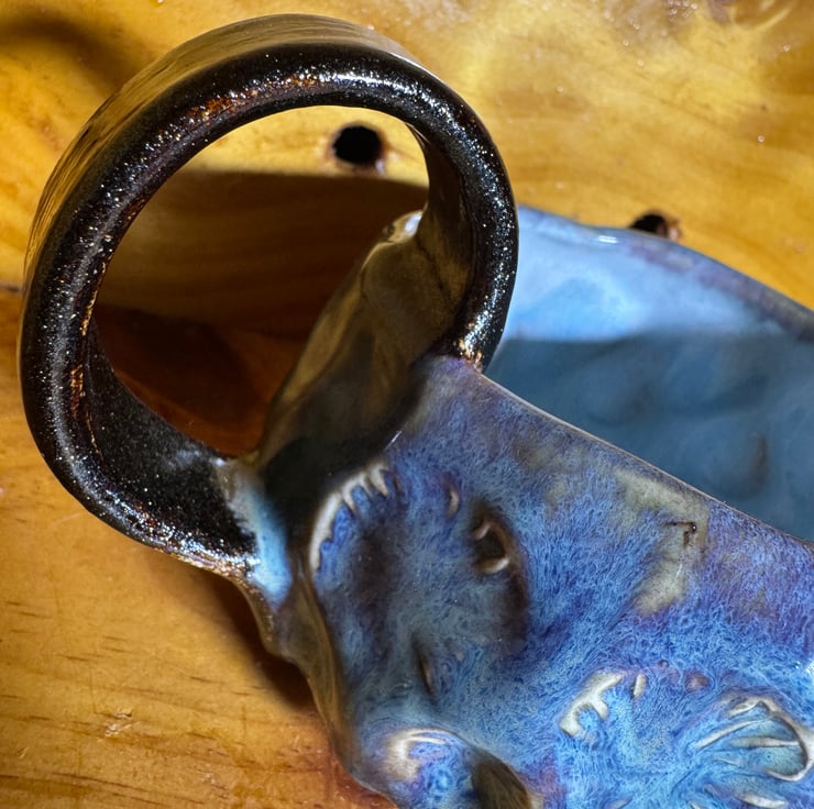 Drippy glorious glaze flows over unique stamped clay and boasts a big sparkly handle too