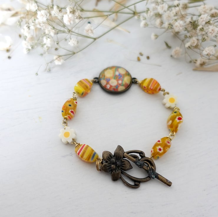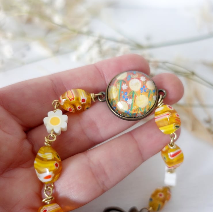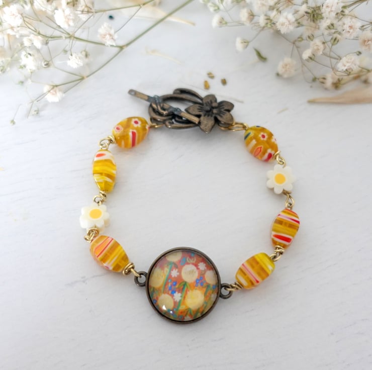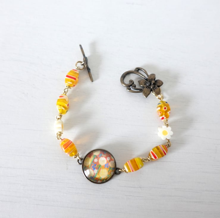 This handmade bracelet features a vibrant art print pendant connector, set in a round bezel and paired with cheerful yellow patterned Millefiori glass beads. The centrepiece showcases a colourful, floral-style design, giving the bracelet an artistic, one-of-a-kind feel.