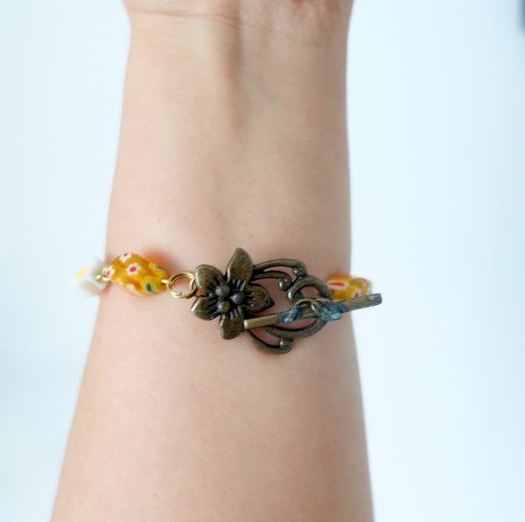 The bracelet is finished with coordinating glass beads in warm mustard tones, accented with white daisy-style beads for a playful, vintage-inspired look. An antique-style clasp completes the design, making it both practical and eye-catching.