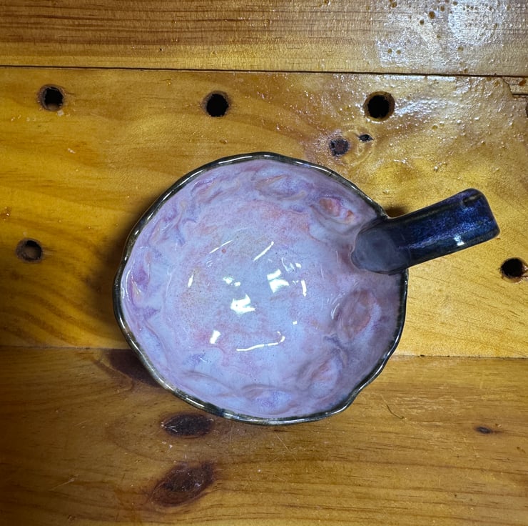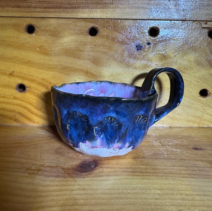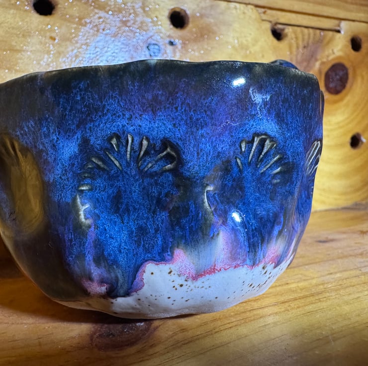Handbuilt by myself with stamps I made myself too it holds approximately 250ml of your desired liquid