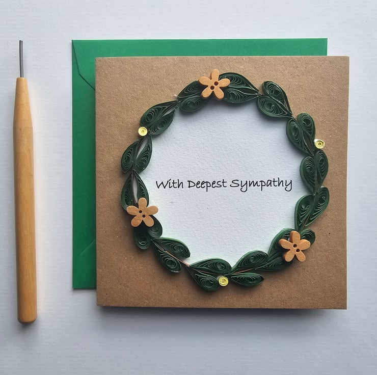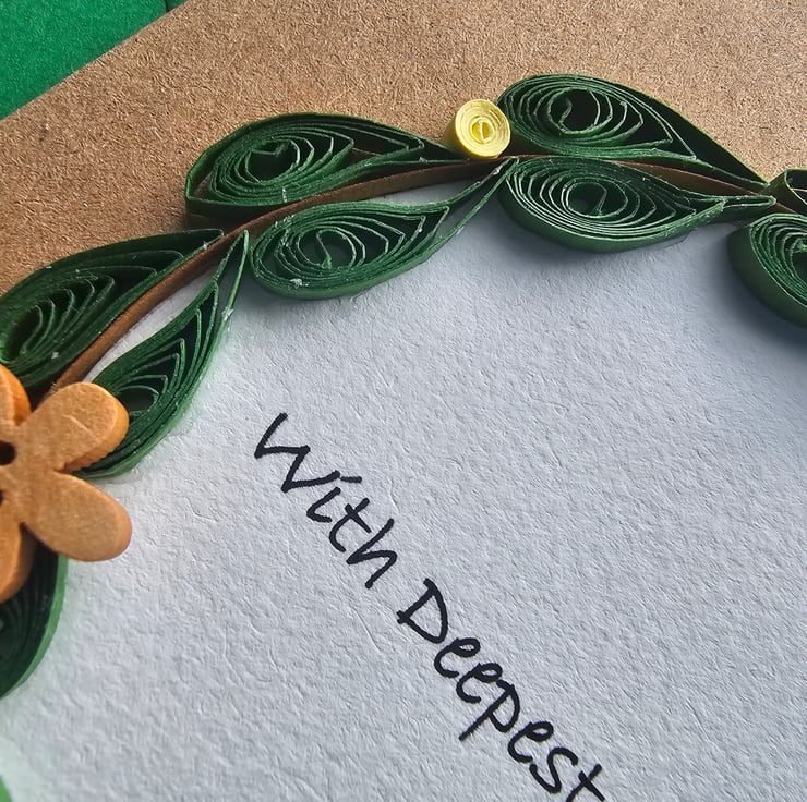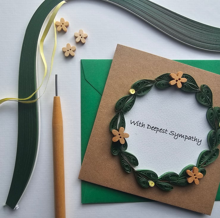 A beautiful and unique handmade card to use to let a bereaved friend/ relative that your are thinking of them. It features a quilled evergreen wreath.