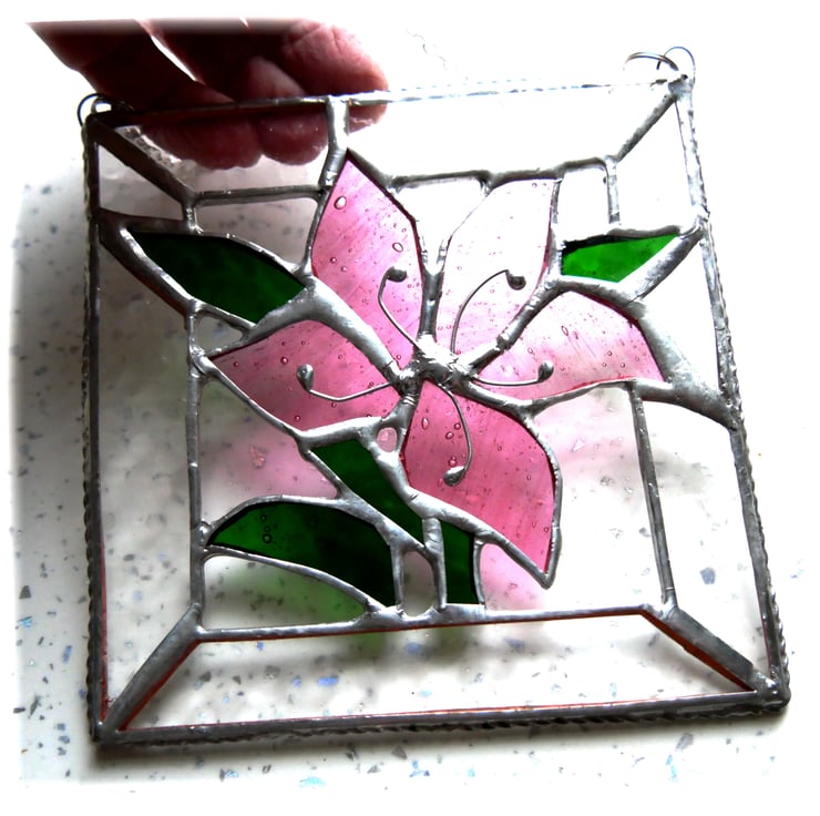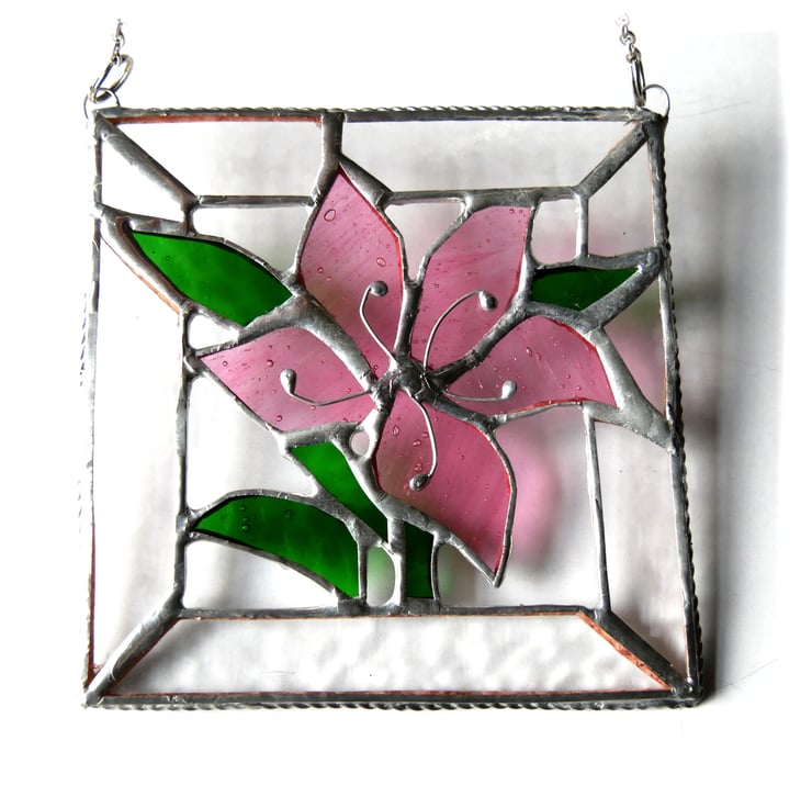 The suncatcher is 15 cm square and hangs from a little silvery chain which is securely attached at either side of the top. It shines beautifully when hanging in the light and shows the lovely textures of the glass.