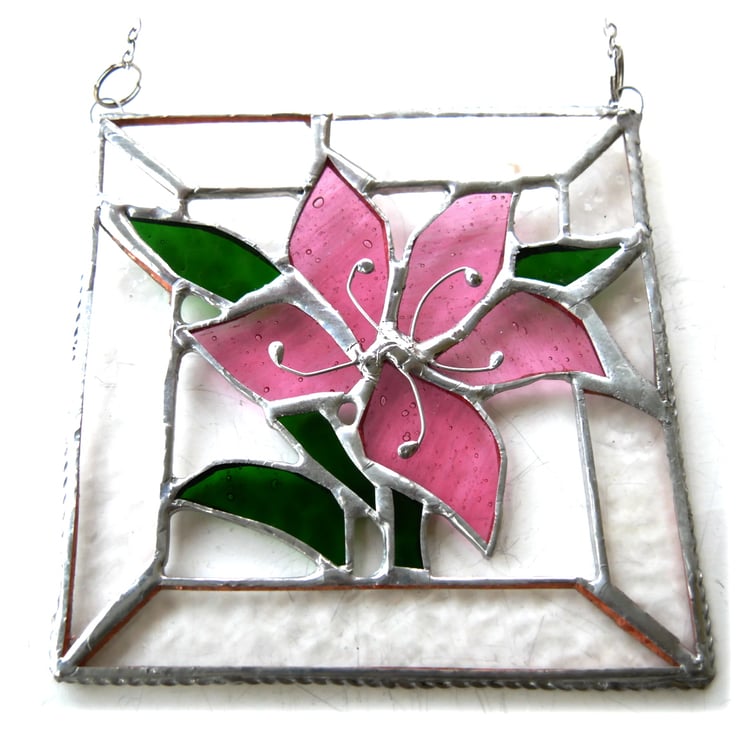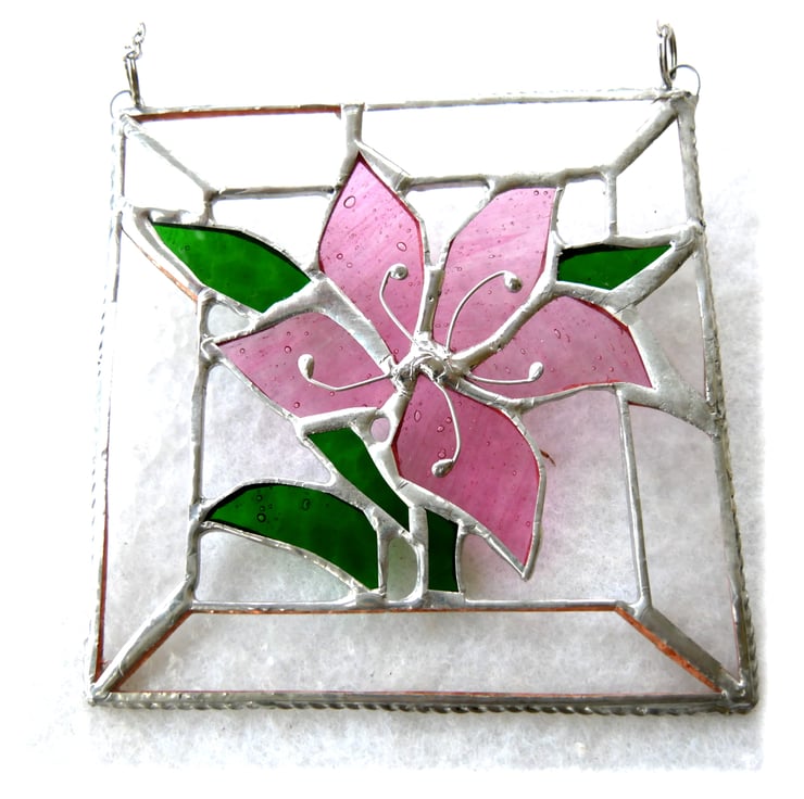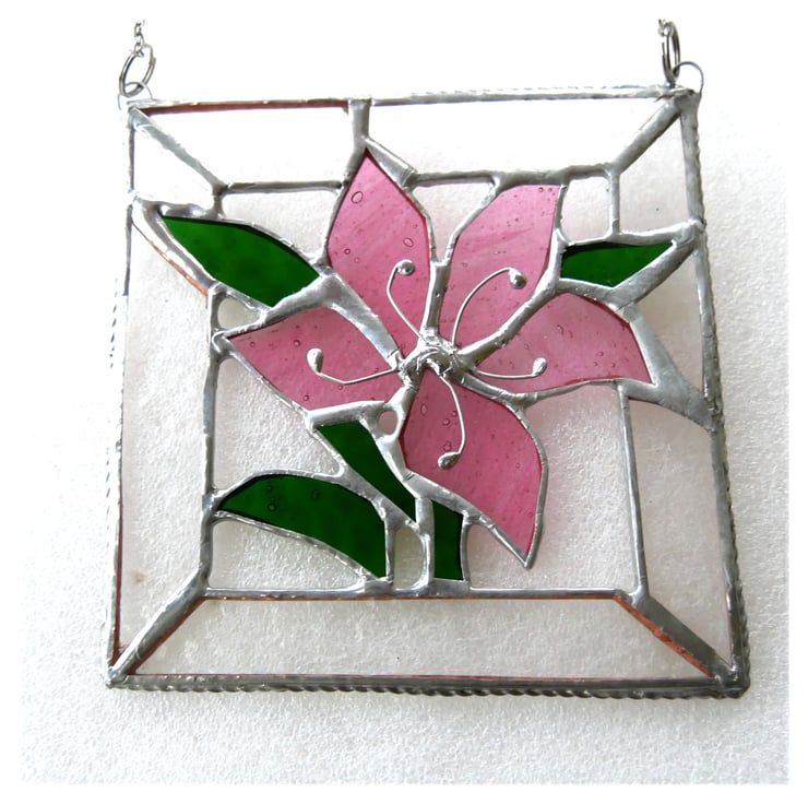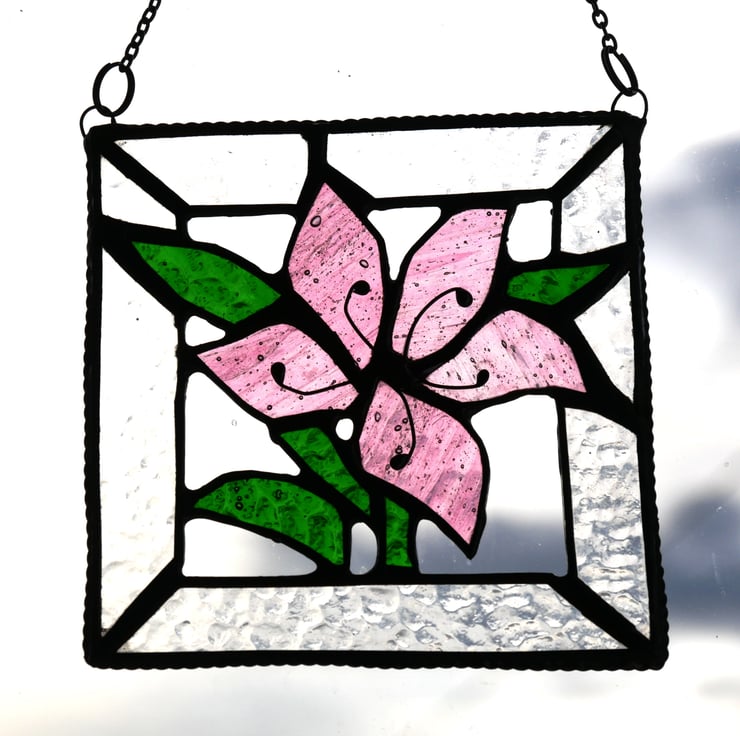 A lovely slightly streaky pink lily with bright green leaves all framed with pretty textured clear glass..