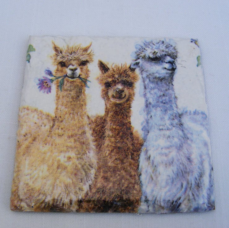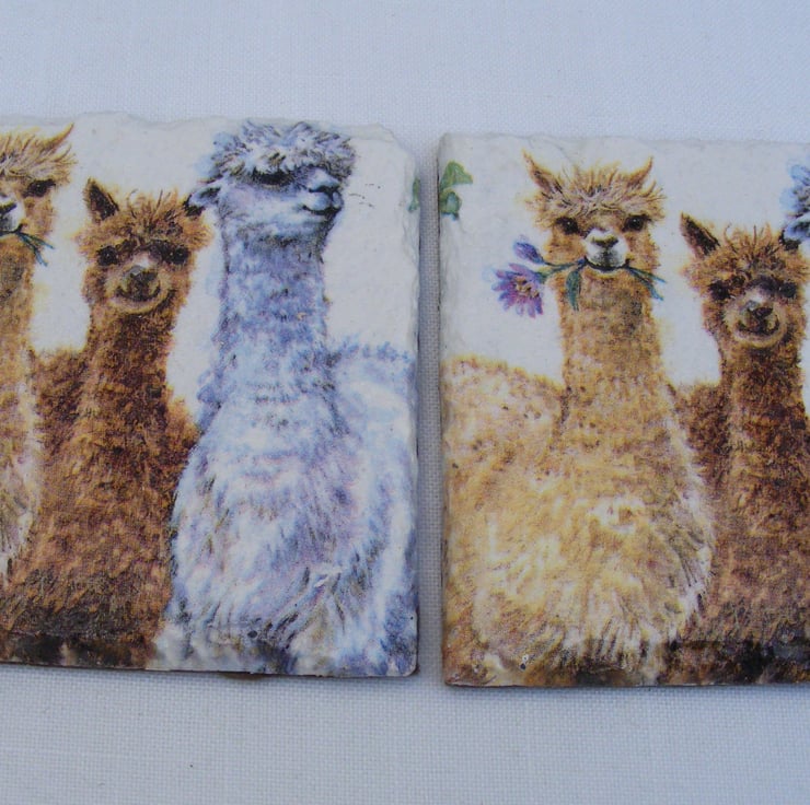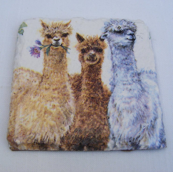 Coasters have been decoupaged with alpaca napkins. Then varnished 3 times for durability. Coaster bottoms are felted and have 4 feet attached. Wipe clean only, submerging in water will ruin the coasters.