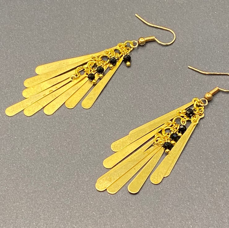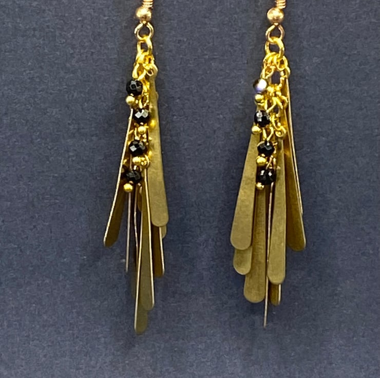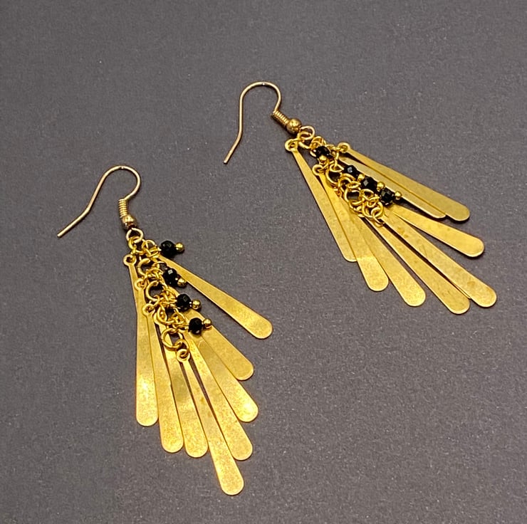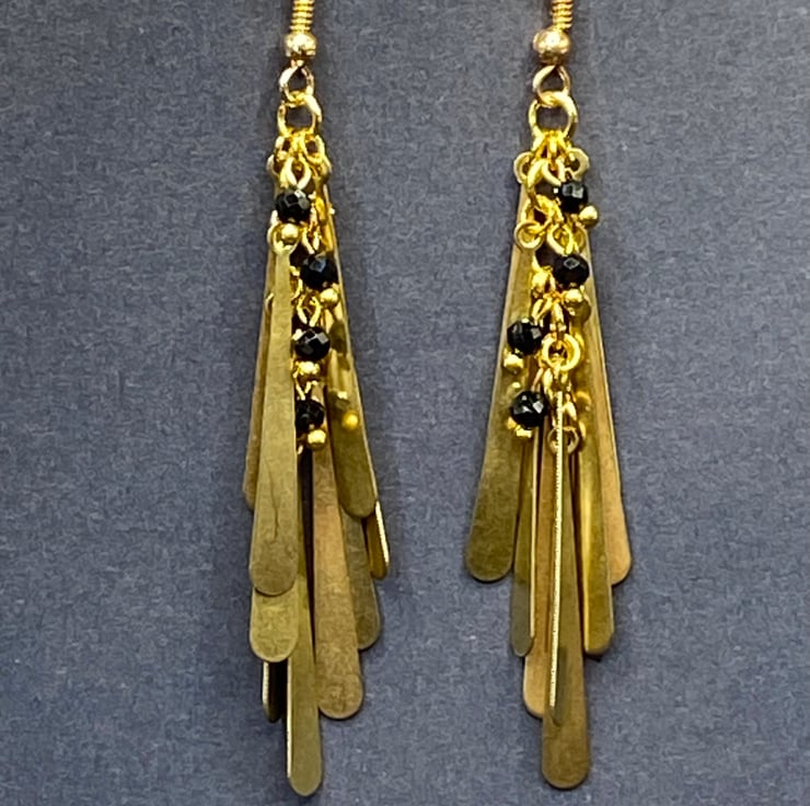 A pair of chandelier style earrings featuring gold tone metal drop shapes, with a column of 3mm faceted black spinel stones peeking out between the drops giving a beautiful subtle sparkle.
