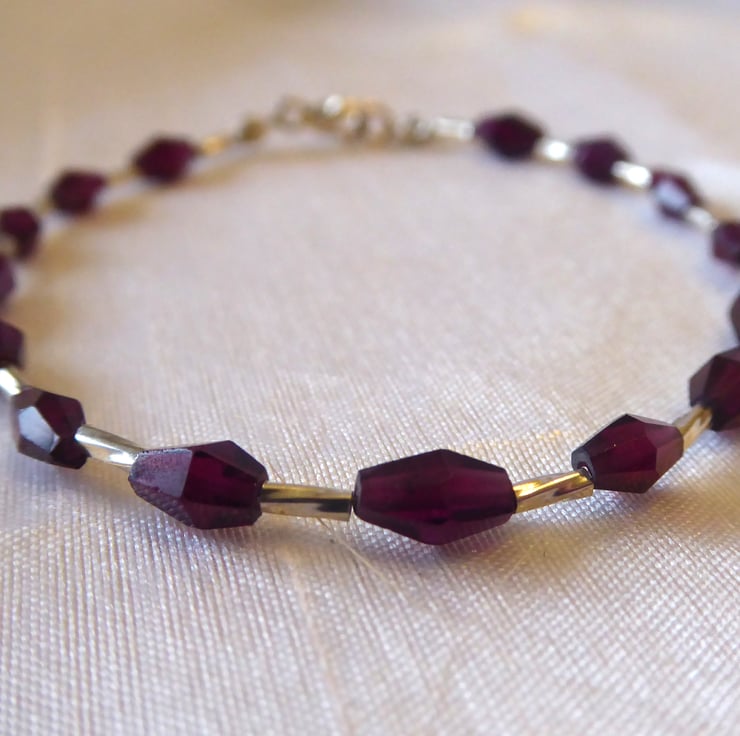 The faceted bicone garnets (approx.6mm x 4mmr) are accented with tiny, textured, sterling silver tube beads and the bracelet is finished with sterling silver fittings including a lobster clasp